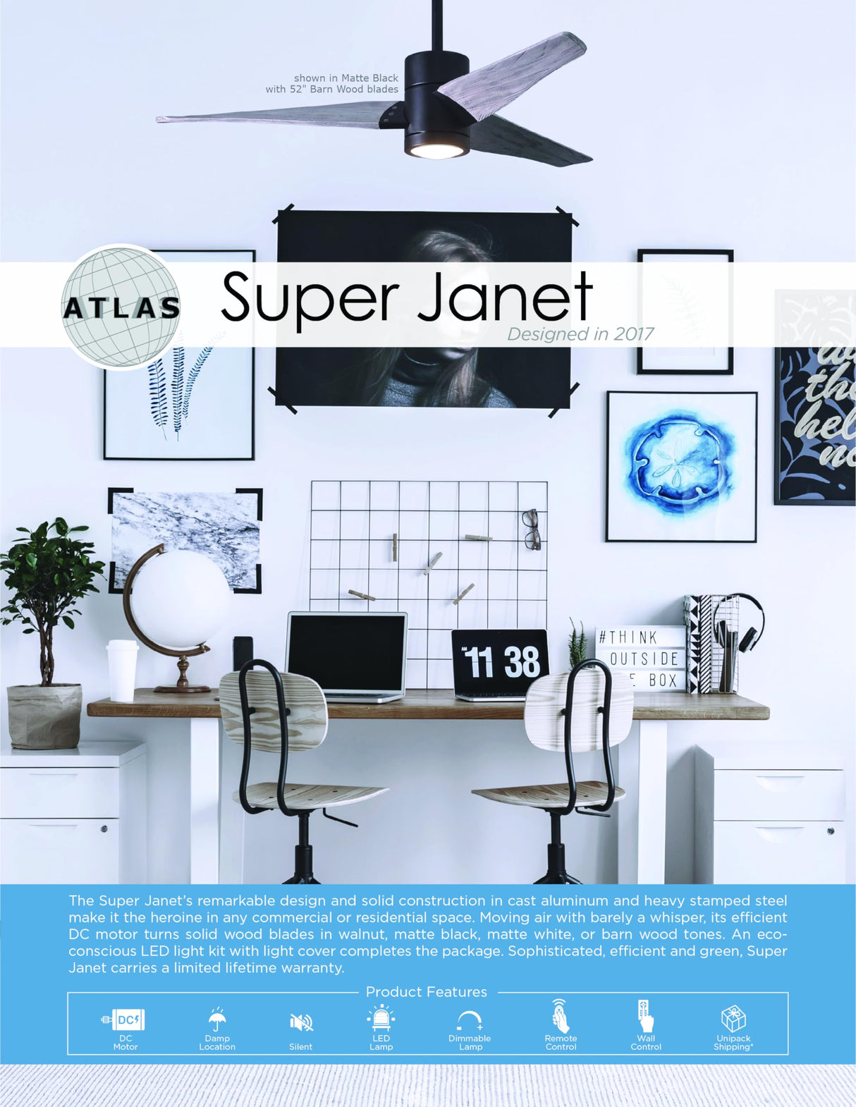 The Super Janet’s remarkable design and solid construction in cast aluminum and heavy stamped steel make it the heroine in any commercial or residential space. Moving air with barely a whisper, its efficient DC motor turns solid wood blades in walnut, matte black, matte white, or barn wood tones. An eco-conscious LED light kit with light cover completes the package. Sophisticated, efficient and green, Super Janet carries a limited lifetime warranty.