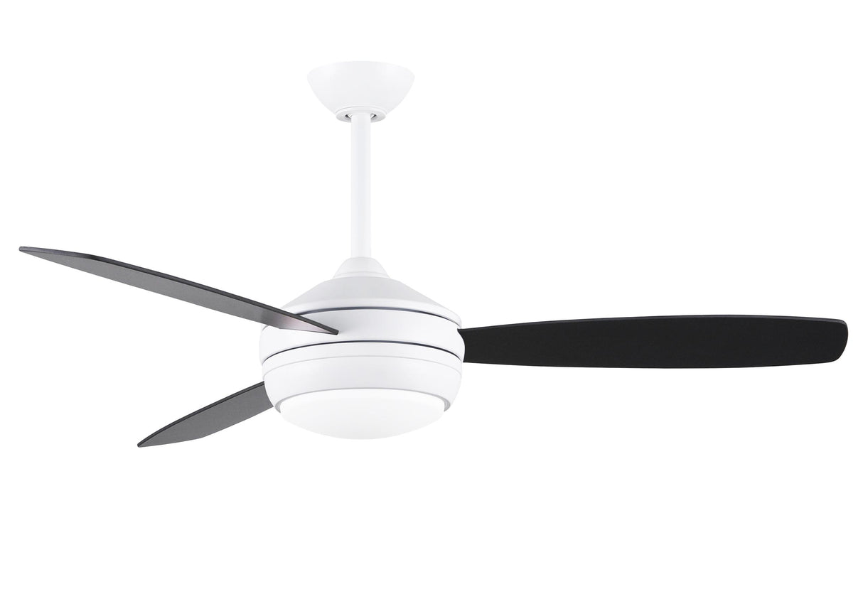 T-24 efficient 4-speed ceiling fan in Matte White finish with reversible 52" Old Oak/Matte Black blades and LED light kit.