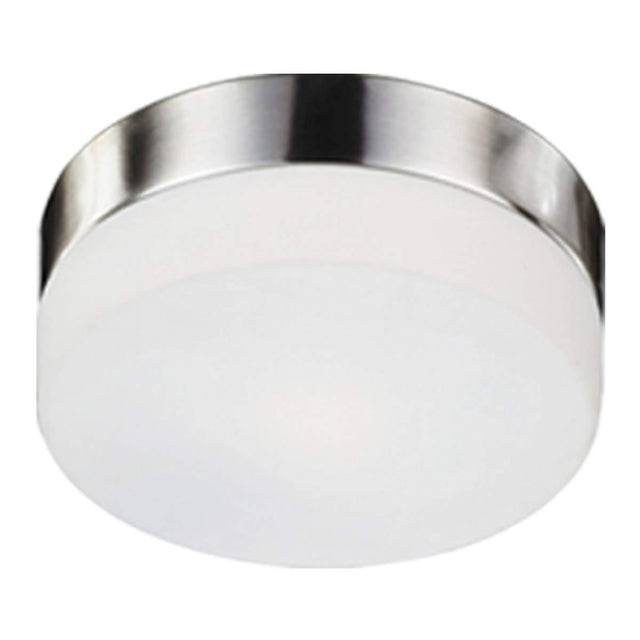 Single lamp flush mount ceiling fixture with white round opal glass and your choice of bronze or chrome metal finishes.