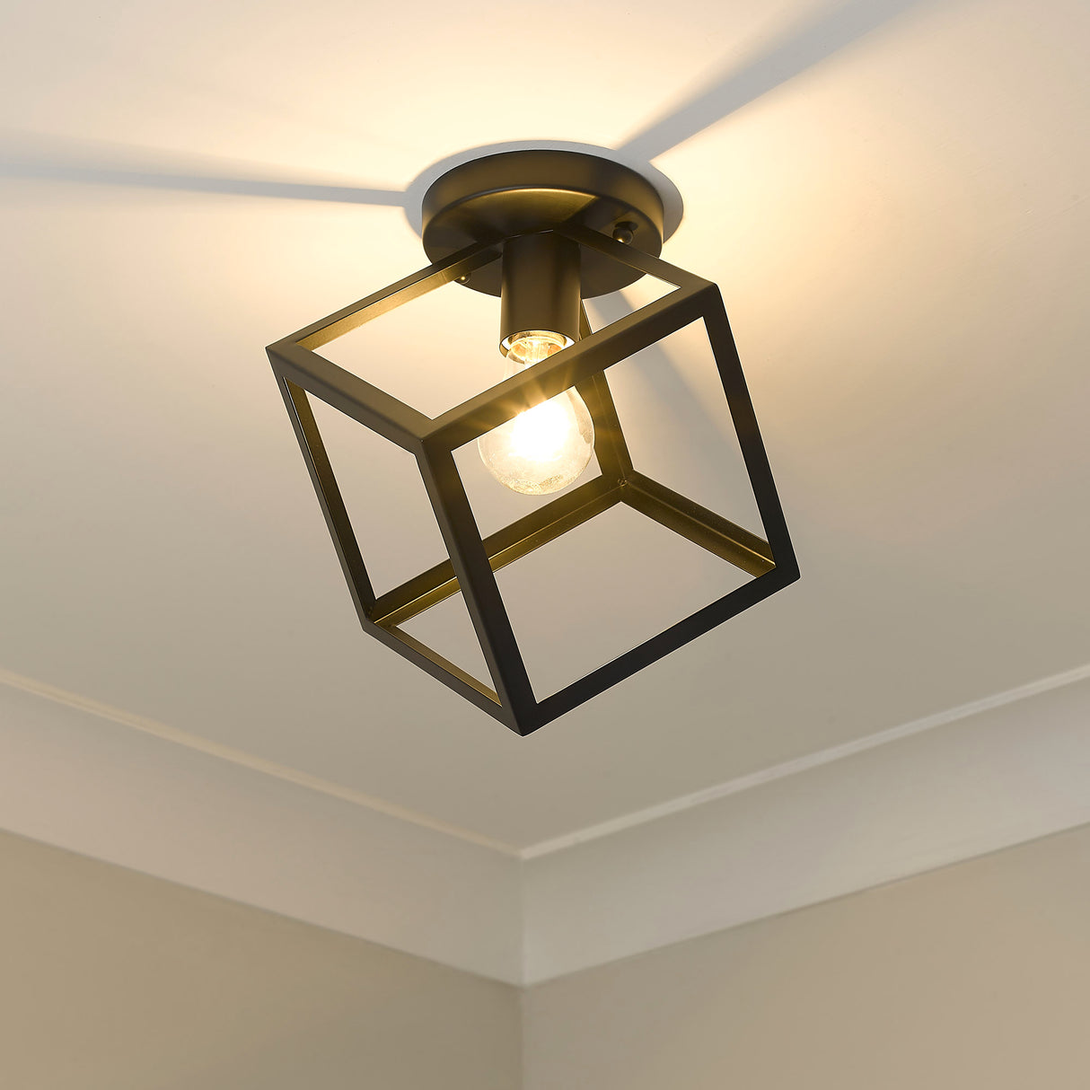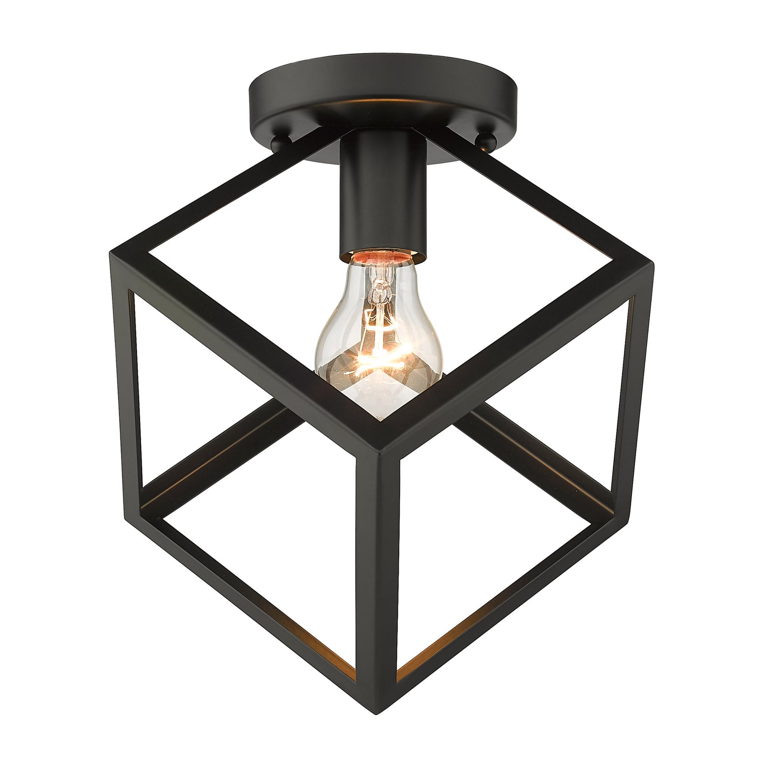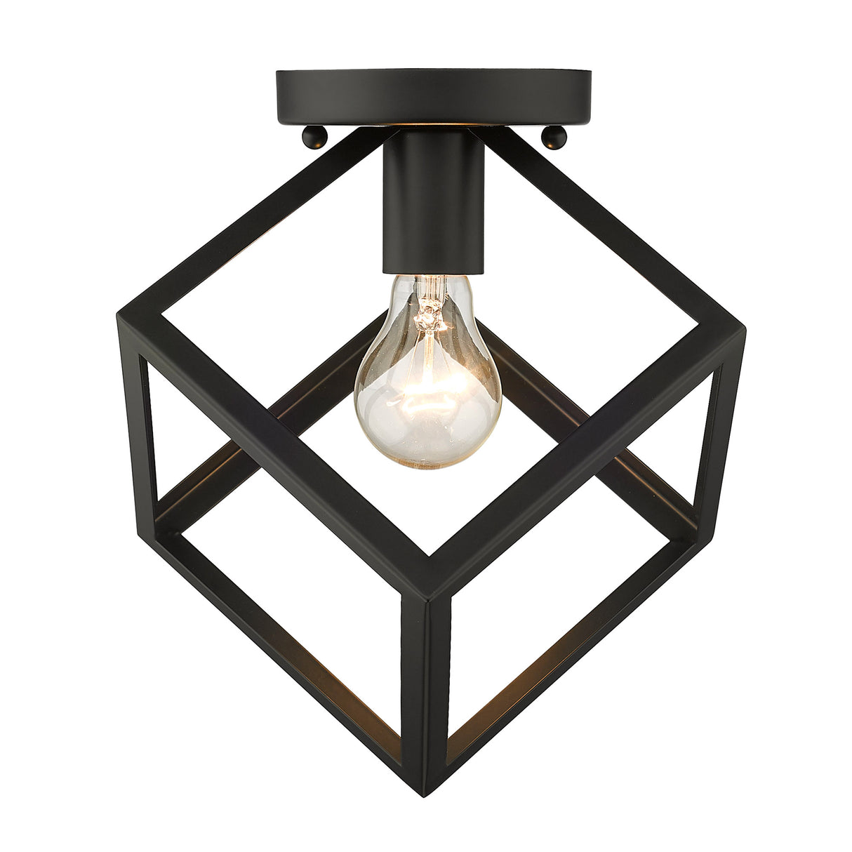 Strong, industrial lines and a unique geometric design are the basis of the Cassio series. Dramatic, double edges and bold lines make Cassio a focal point that is sure to add visual interest to any space. As if frozen in space, an exposed lamp sits within a suspended 3-dimensional cube. The open, glass-free cage lends an airy, playful tone while providing utility in the form of widespread light and easy bulb changes. Choose between trending metal finishes like Olympic Gold and Matte Black.