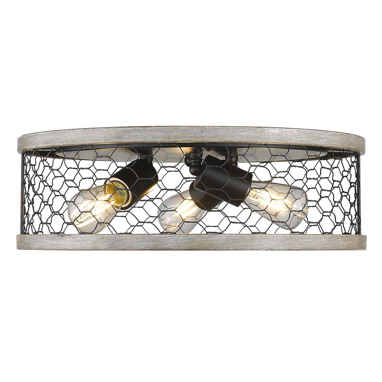 The Bailey collection brings casual, rustic styling to any space. On-trend with modern country interior design, this fixture is perfect for homes with farmhouse décor. The open bottom shade features rustic chicken wire held together by a hand-painted faux wood frame. The faux wood frame contains hints of gray and brown hues. Add a bit of country-chic style to any bathroom, kitchen, living room, entry, or hallway.