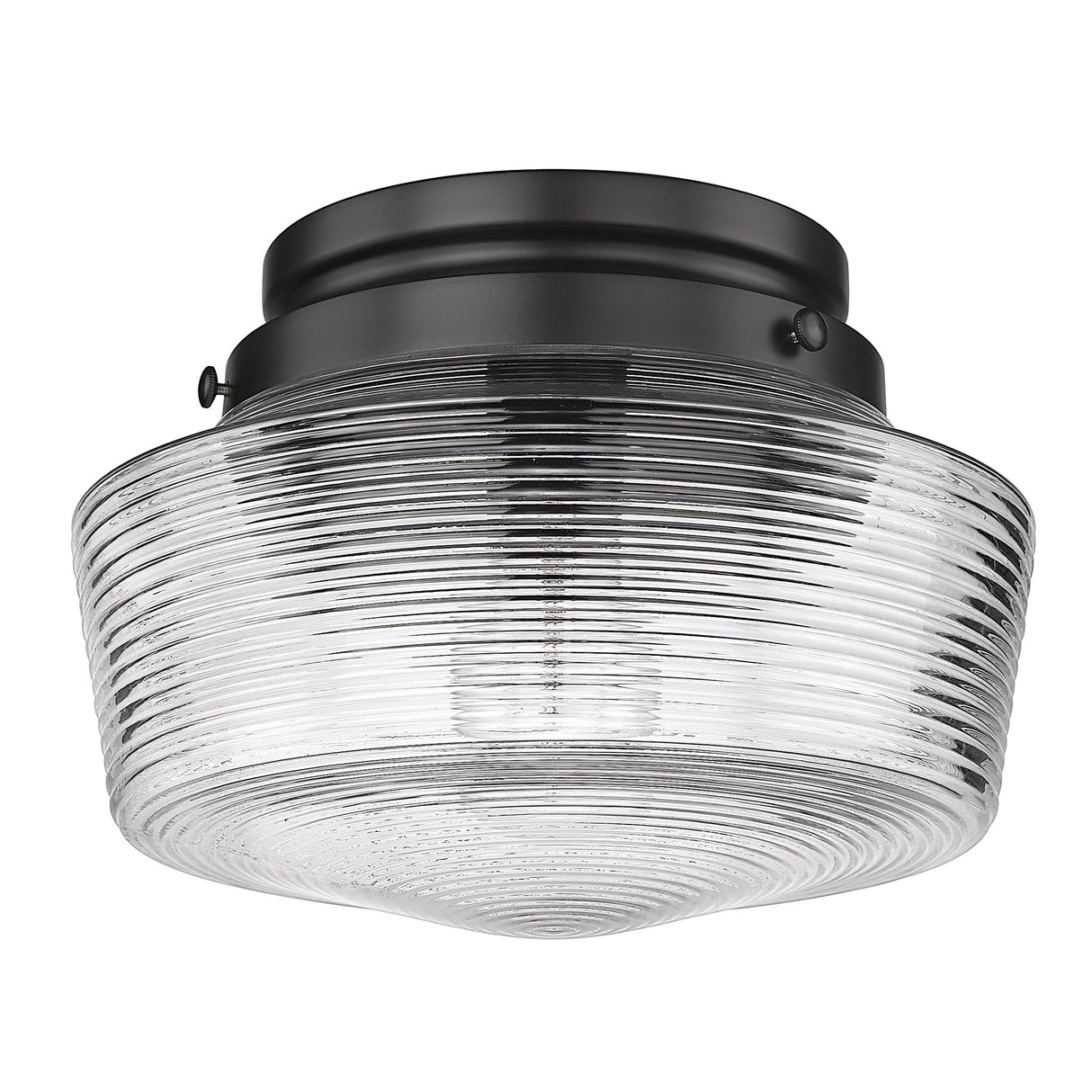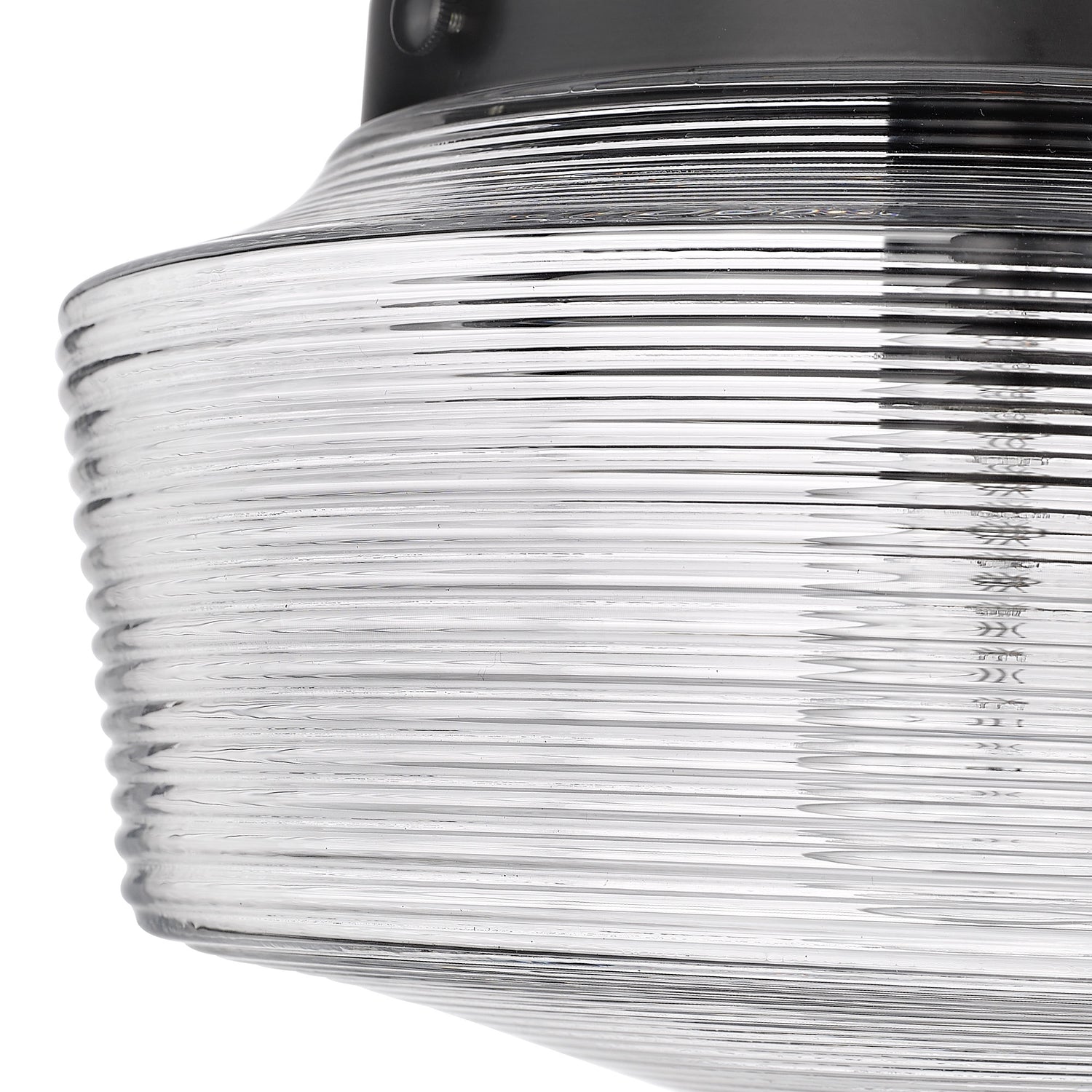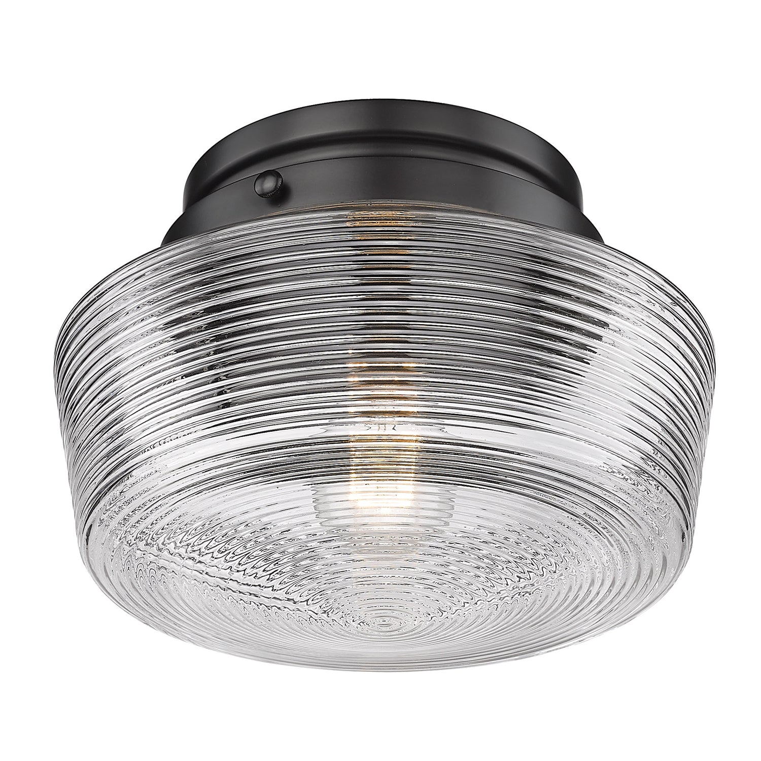 Suited for classic and transitional interiors, Holloway is a schoolhouse fixture with a vintage-inspired aesthetic. The texture of the glass contrasts The smoothness of the Matte Black finish. Horizontal lines in the glass mimic a pattern seen on retro décor and draw the eye while gently diffusing light. Elevate the look of your home with this charming flush mount. Damp-rated with a Low-profile design that allows for more overhead space, Holloway is perfect for hallways and bathrooms.