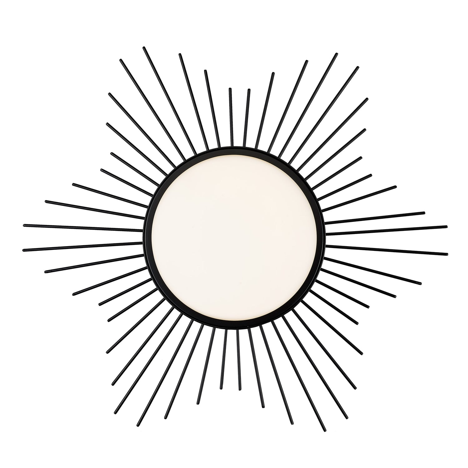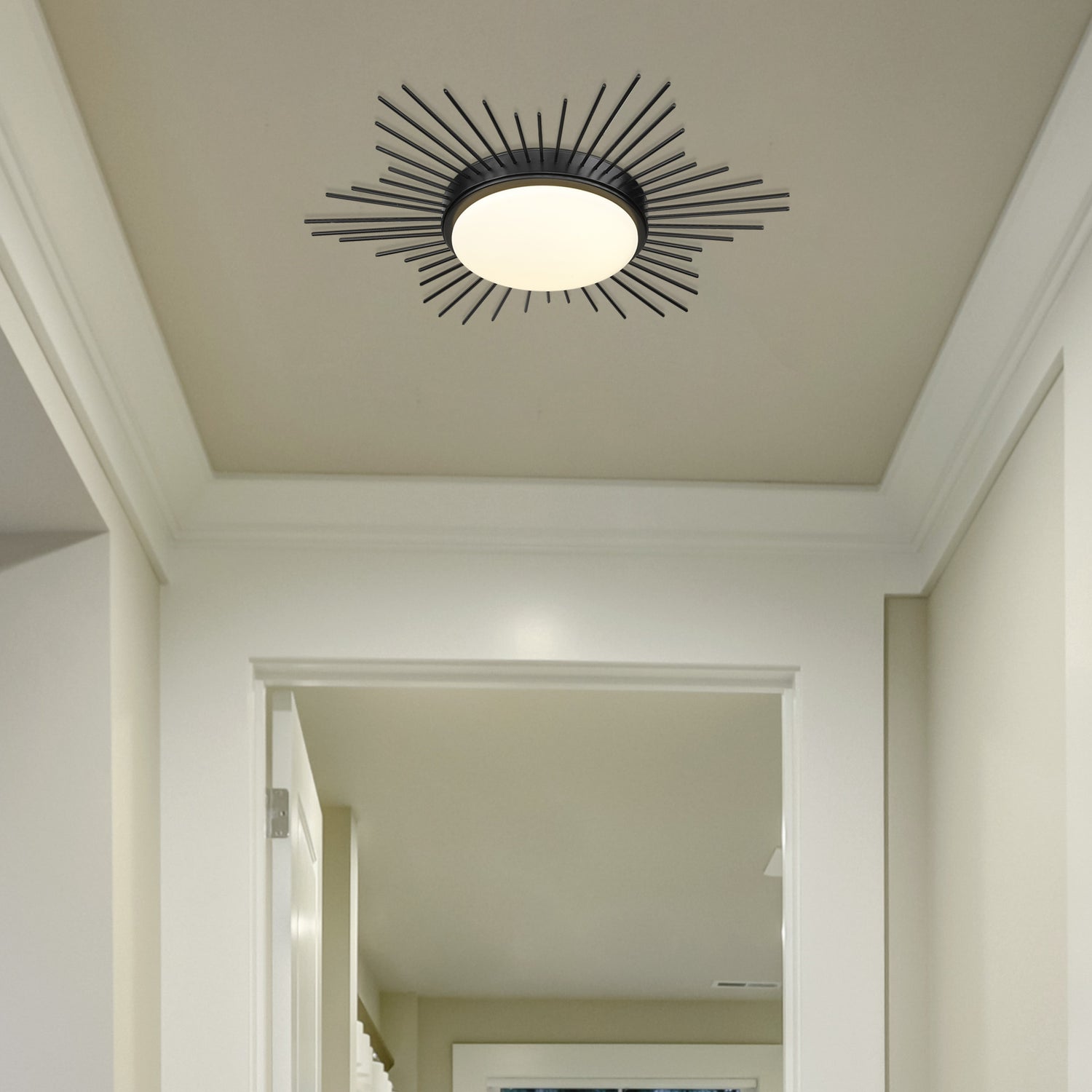 Enhance your space with Kieran. Artsy in nature, this collection of flush mounts with ceiling medallions is playful yet functional. Thin metal pieces in varying lengths form a sunburst pattern that creates a halo effect around the fixture. Damp-rated, this elegant series sits close-to-ceiling and is perfect for dressing up a closet, hall, bedroom, or breezeway. Opal glass shades diffuse the bright LED panels. The fixtures are available in multiple sophisticated finishes. This flush mount provides wide-spread ambient lighting and is a perfect fit in your home.