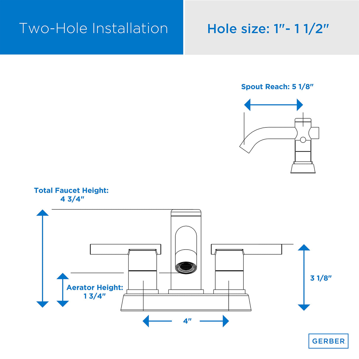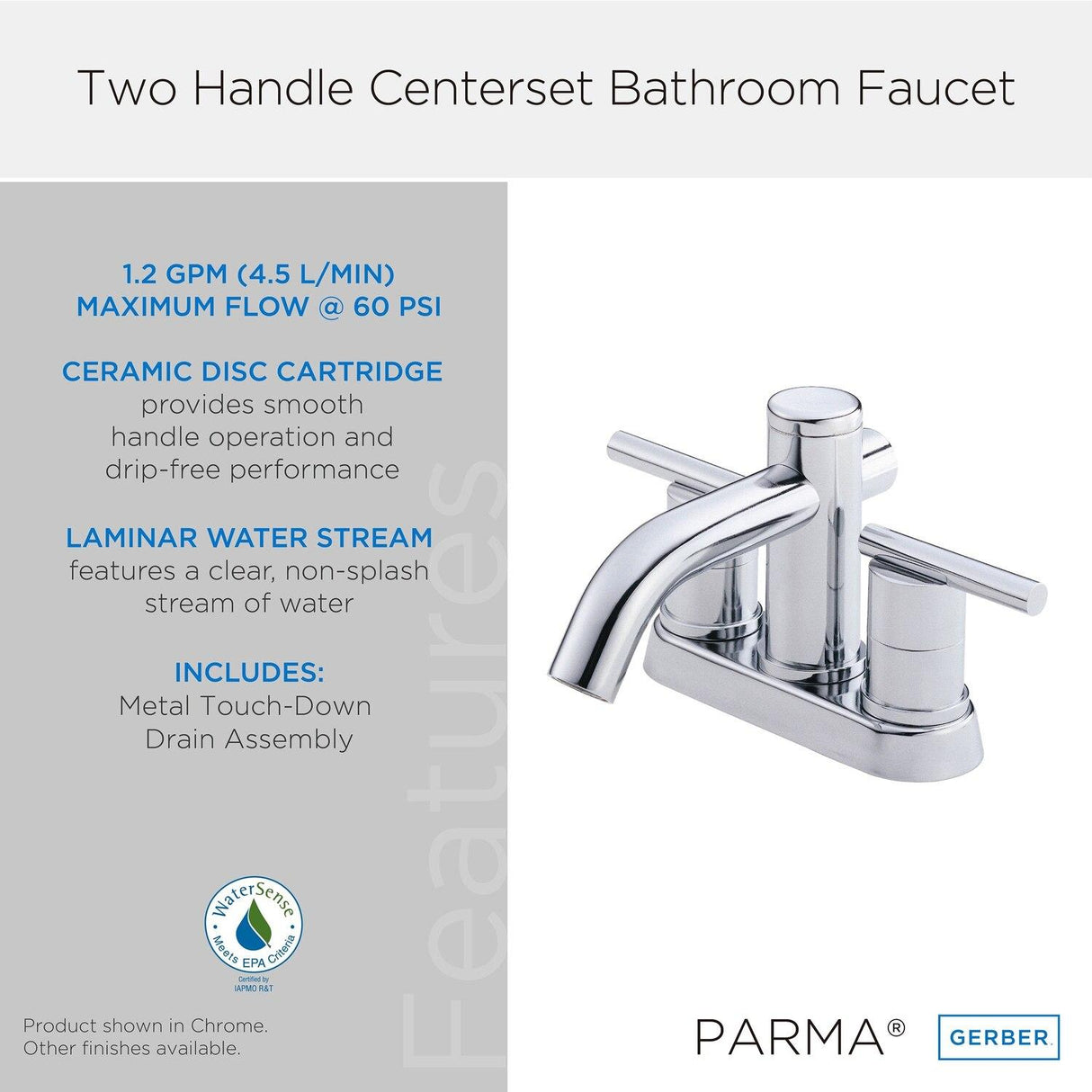 Product DescriptionGerber Plumbing has been manufacturing premium plumbing accessories from shower heads to faucets to china fixtures since 2001. Not only providing necessities, the products include a variety of decorative faucets and bath accessories. Designed with comfort, durability and style in mind, there is no question that this should be your choice when it comes to modern plumbing.From the ManufacturerFor nearly 20 years, the kitchen and bath industry has known Danze as a leader in product design and beautiful styling. What industry professionals and homeowners may not have known is that Danze has a sister company, Gerber - an 85-year-old manufacturer of some of the highest performing, most reliable products on the market. To best meet the diverse and ever-changing needs of home products, Danze has transformed to be Danze by Gerber, a perfect blend of the handcrafted, trusted performance of Gerber on the inside and beautiful design on the outside. The Danze by Gerber product combination can be found in a range of kitchen and bath faucets, bath accessories and shower systems. A thoughtful balance of form and function. Inspired, beautiful design on the outside. Handcrafted, trusted performance on the inside. A combination that results in true value and commitment. You can call it a breath of fresh air. We call it Danze by Gerber. Product Information Product Overview Connection Type: 1/2 -14npsm ConnectionFlow Rate: 1.2gpm Max Flow Rate @ 60 psiInstallation: 3-Hole InstallationSpray/Stream Function: Features a Clear Non-Splash Laminar Water StreamBrand: Danze Features Cartridge Type: Includes Durable Ceramic Disc Valve for Drip-Free PerformanceWarranty: Limited lifetime Description Bold and contemporary the Parma Two Handle Centerset Lavatory Faucet provides a touch down drain for easy installation. Components Drain Type: Includes Metal Touch-Down Drain Assembly for Easy Installation