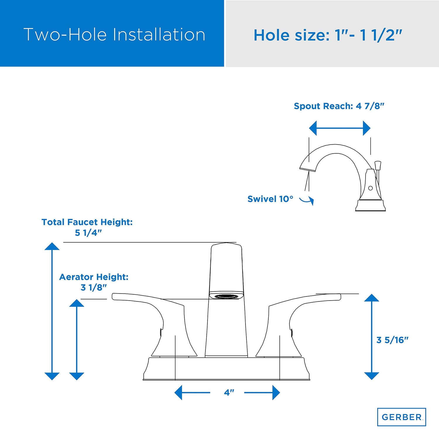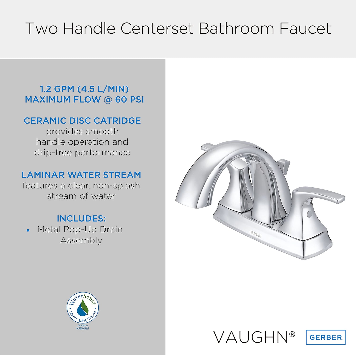 Product DescriptionGerber Plumbing has been manufacturing premium plumbing accessories from shower heads to faucets to china fixtures since 2001. Not only providing necessities, the products include a variety of decorative faucets and bath accessories. Designed with comfort, durability and style in mind, there is no question that this should be your choice when it comes to modern plumbing.From the ManufacturerFor nearly 20 years, the kitchen and bath industry has known Danze as a leader in product design and beautiful styling. What industry professionals and homeowners may not have known is that Danze has a sister company, Gerber - an 85-year-old manufacturer of some of the highest performing, most reliable products on the market. To best meet the diverse and ever-changing needs of home products, Danze has transformed to be Danze by Gerber, a perfect blend of the handcrafted, trusted performance of Gerber on the inside and beautiful design on the outside. The Danze by Gerber product combination can be found in a range of kitchen and bath faucets, bath accessories and shower systems. A thoughtful balance of form and function. Inspired, beautiful design on the outside. Handcrafted, trusted performance on the inside. A combination that results in true value and commitment. You can call it a breath of fresh air. We call it Danze by Gerber. Product Information Product Overview Connection Type: 1/2 -14npsm ConnectionFlow Rate: 1.2gpm Max Flow Rate @ 60 psiInstallation: 3-Hole InstallationSpray/Stream Function: Features a Clear Non-Splash Laminar Water StreamBrand: Gerber Features Cartridge Type: Includes Durable Ceramic Disc Valve for Drip-Free PerformanceWarranty: Limited lifetime Components Drain Type: Includes Metal Pop-Up Drain Assembly for Easy InstallationIncludes: Optional Hot/Cold Temperature Indicators