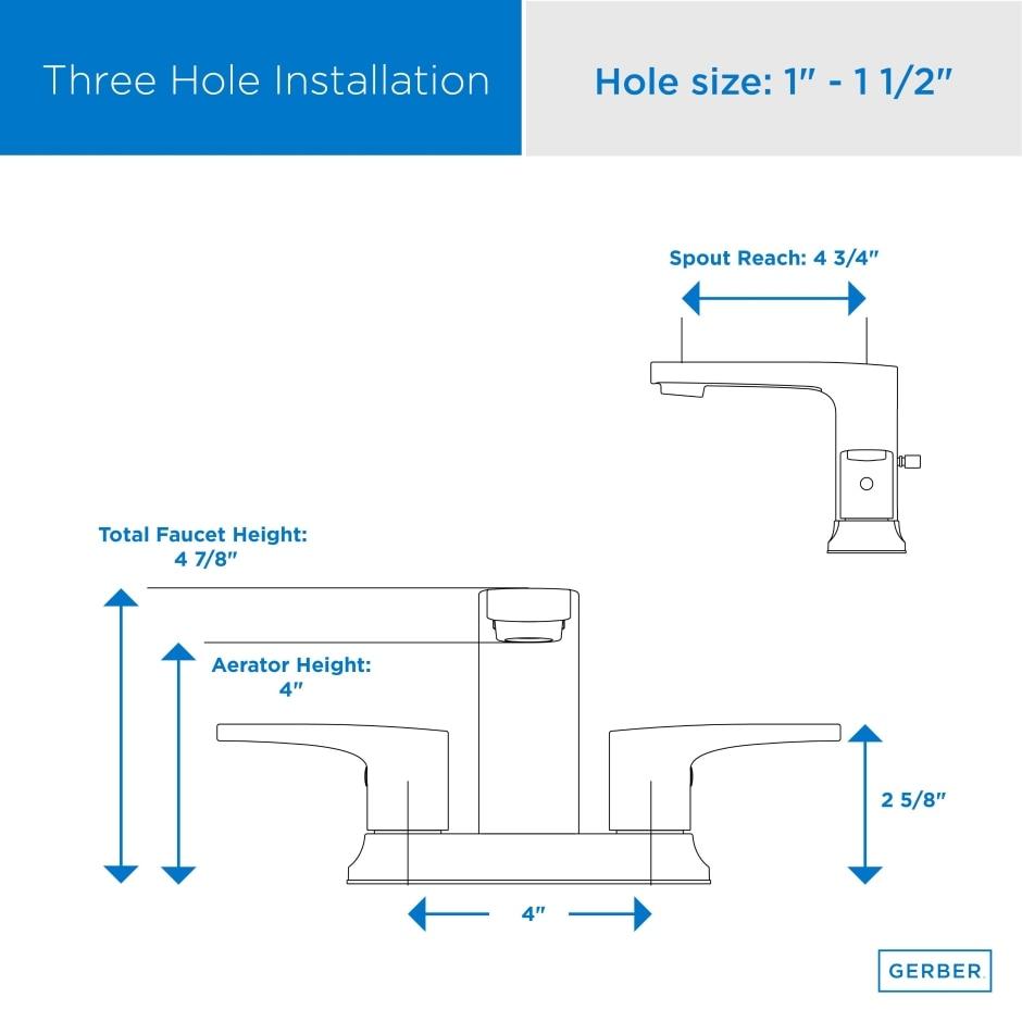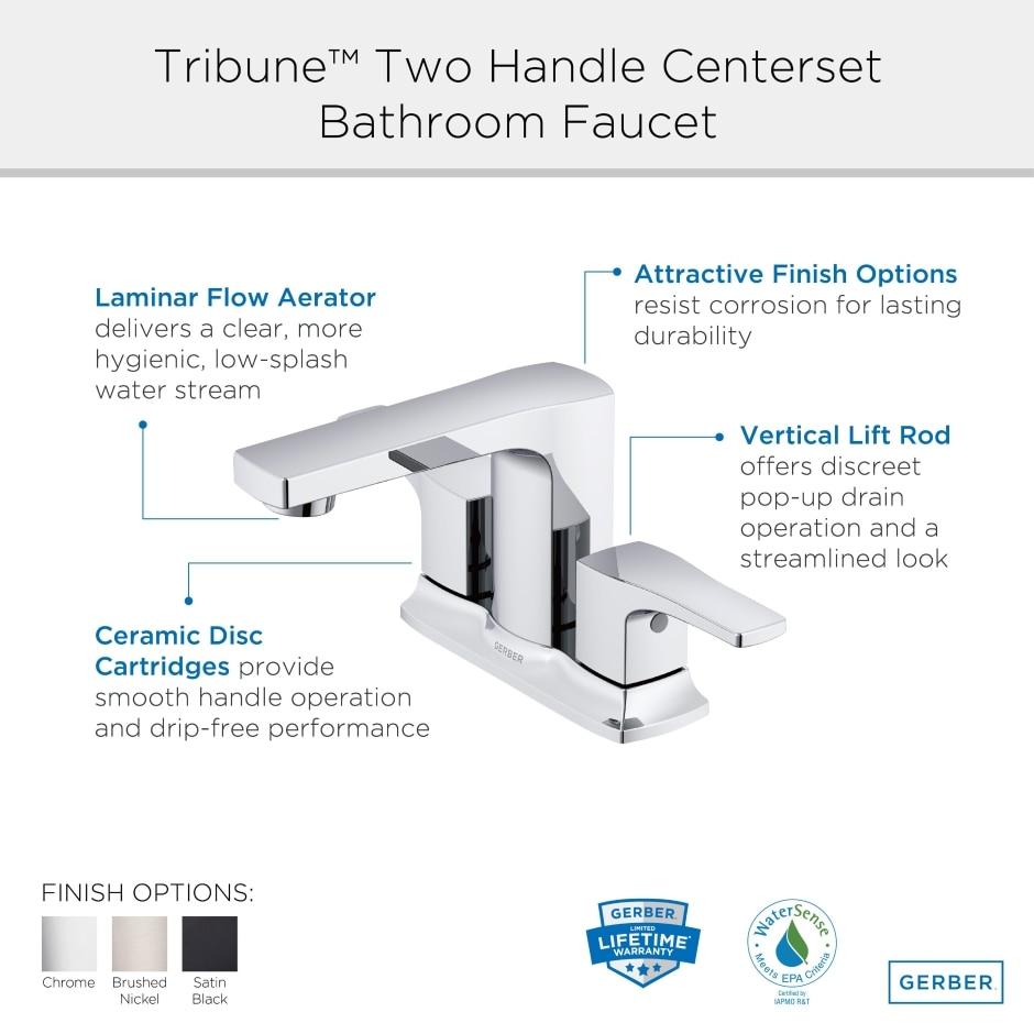 With modern lines and soft curves, the Tribune centerset bathroom faucet sets the stage for style. Square forms are offset by gently flaring curves that flow together to form a modern aesthetic. Unique Vertical Lift Rod is discreetly designed into the back of the faucet spout for an uninterrupted look. Offering a full complement of coordinated sink, shower, and tub faucets and trim, let the Tribune's softly contoured square forms and stunning finish options elevate your bathroom to a modern level. Product Information Product Overview Connection Type: 1/2 -14npsm ConnectionFlow Rate: 1.2gpm Max Flow Rate @ 60 psiInstallation: 3-Hole InstallationSpray/Stream Function: Features a clear no-splash Laminar Flow for a more hygienic water experienceBrand: Gerber Features Optional Temperature Indicators includedOptional Lift Rod Hole Plug includedCartridge Type: Includes Durable Ceramic Disc Valve for Drip-Free PerformanceWarranty: Limited lifetime Description With modern lines and soft curves the Tribune centerset bathroom faucet sets the stage for style. Square forms are offset by gently flaring curves that flow together to form a modern aesthetic. Unique Vertical Lift Rod is discreetly designed into the back of the faucet spout for an uninterrupted look. Offering a full complement of coordinated sink shower and tub faucets and trim let the Tribune s softly contoured square forms and stunning finish options elevate your bathroom to a modern level. Components Cartridge Included: YesDrain Type: Includes 50/50 Pop-Up Drain Assembly for Easy InstallationSold Separately Optional: Alternative Flow Rates Available with Spray Water Stream: 1.0 gpm when used with Da603a50n aerator ; 0.5 gpm when used with Da603a51n aerator