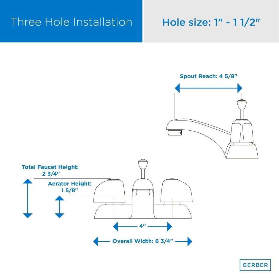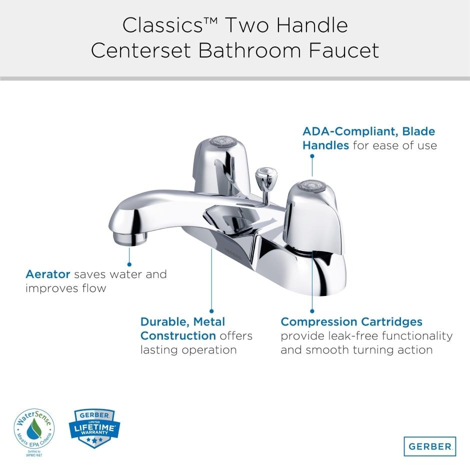 DescriptionChrome finish | cast bronze center set | 2.2 GPM aerator | compression style | brass pop up - manufacturer: Gerber Plumbing Product Information Product Overview Flow Rate: 1.2gpmInstallation: 3-Hole InstallationBrand: Gerber Features Ada CompliantLead Free Waterway per Nsf/ansi 372Metal Pop-Up Drain AssemblyWith Hot and Cold IndicatorCartridge Type: Includes Compression Cartridges Description Gerber offers a complete line of classic faucets for residential multi-family and light commercial use. Gerber Classics deliver practical and consistent performance at a compelling value. With their sturdy construction Gerber Classics install quickly and securely to get the job done right. Components Drain Type: Includes Metal Pop-Up Drain Assembly for Easy Installation