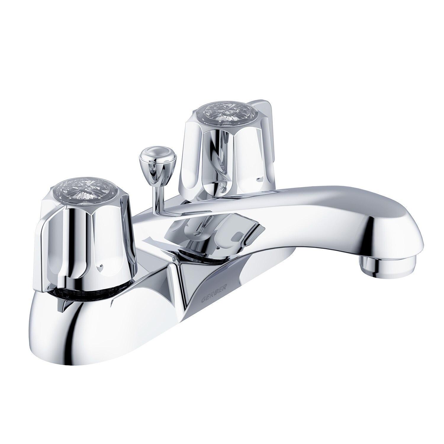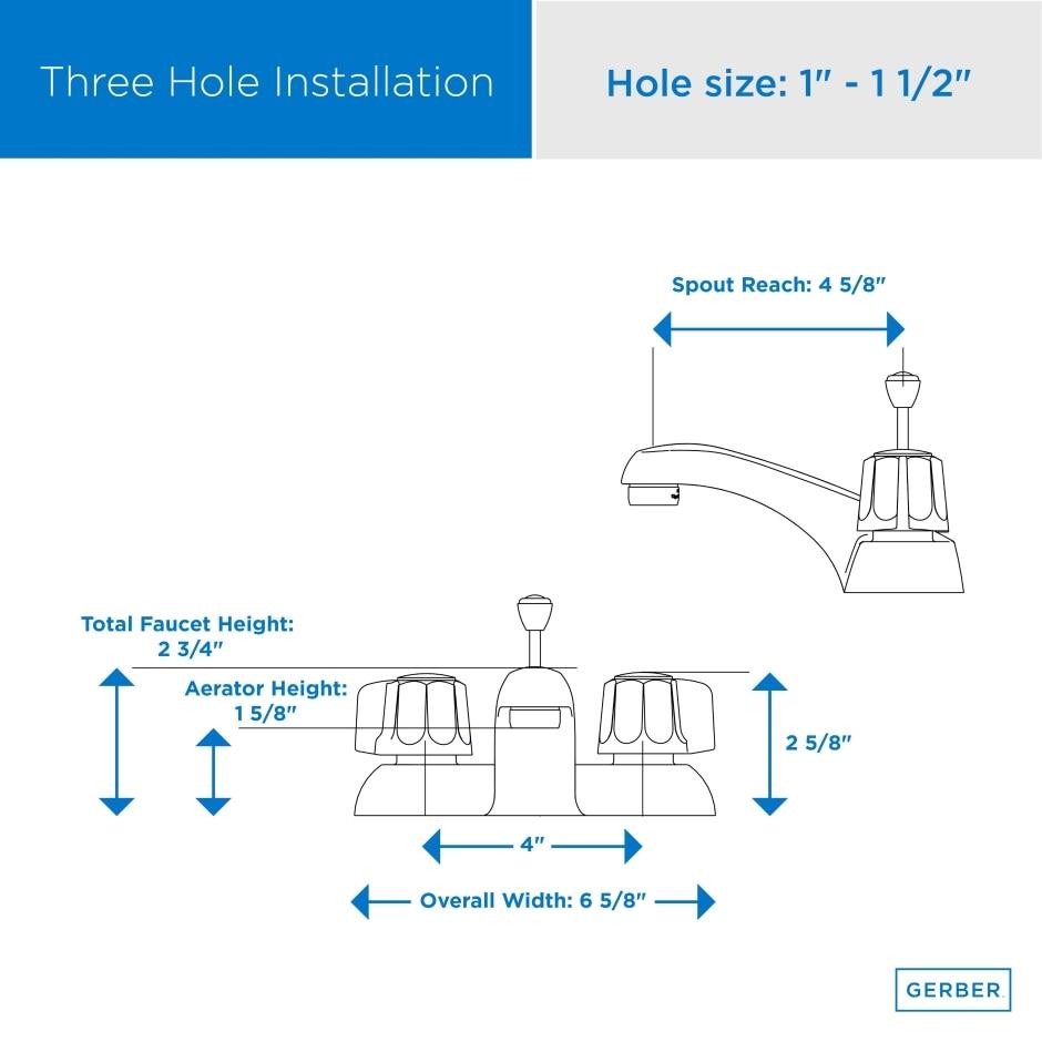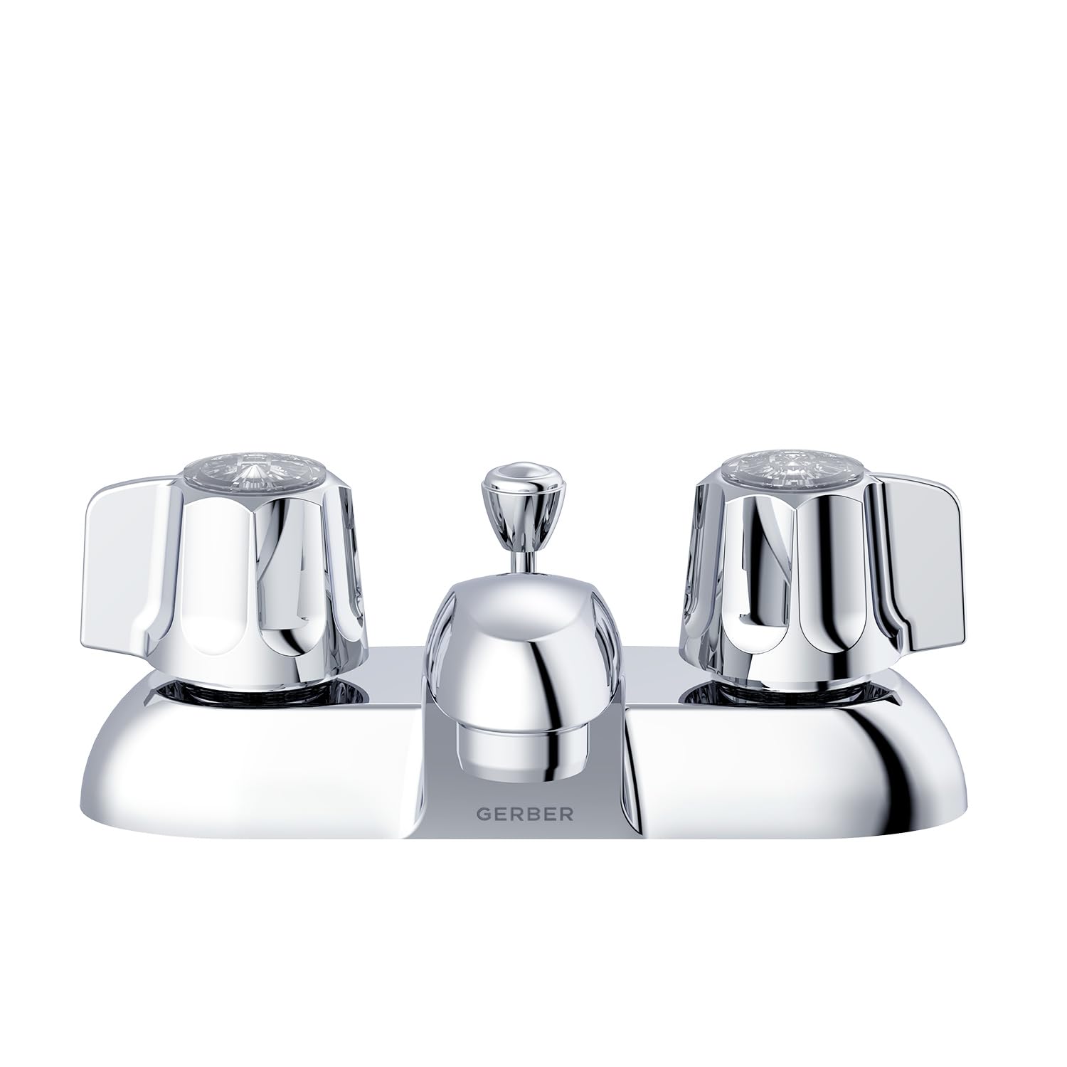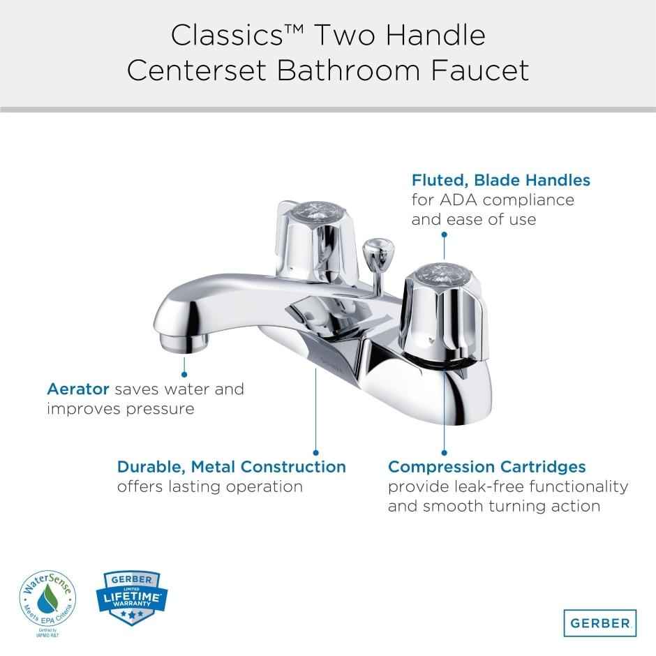 DescriptionCompression cartridges, 4Centers, 3-hole installation. Top mount design. Metal fluted handles with acrylic index buttons. One piece heavy chrome plated, solid brass casting. 2.2 GPM maximum aerator at 60 PSI. Heavy chrome plated finish. Limited lifetime warranty. - manufacturer: Gerber Plumbing Product Information Product Overview Flow Rate: 1.2gpmInstallation: 3-Hole InstallationBrand: Gerber Features Ada CompliantLead Free Waterway per Nsf/ansi 372Metal Pop-Up Drain AssemblyWith Hot and Cold IndicatorCartridge Type: Includes Compression Cartridges Description Gerber offers a complete line of classic faucets for residential multi-family and light commercial use. Gerber Classics deliver practical and consistent performance at a compelling value. With their sturdy construction Gerber Classics install quickly and securely to get the job done right. Components Drain Type: Includes Metal Pop-Up Drain Assembly for Easy Installation