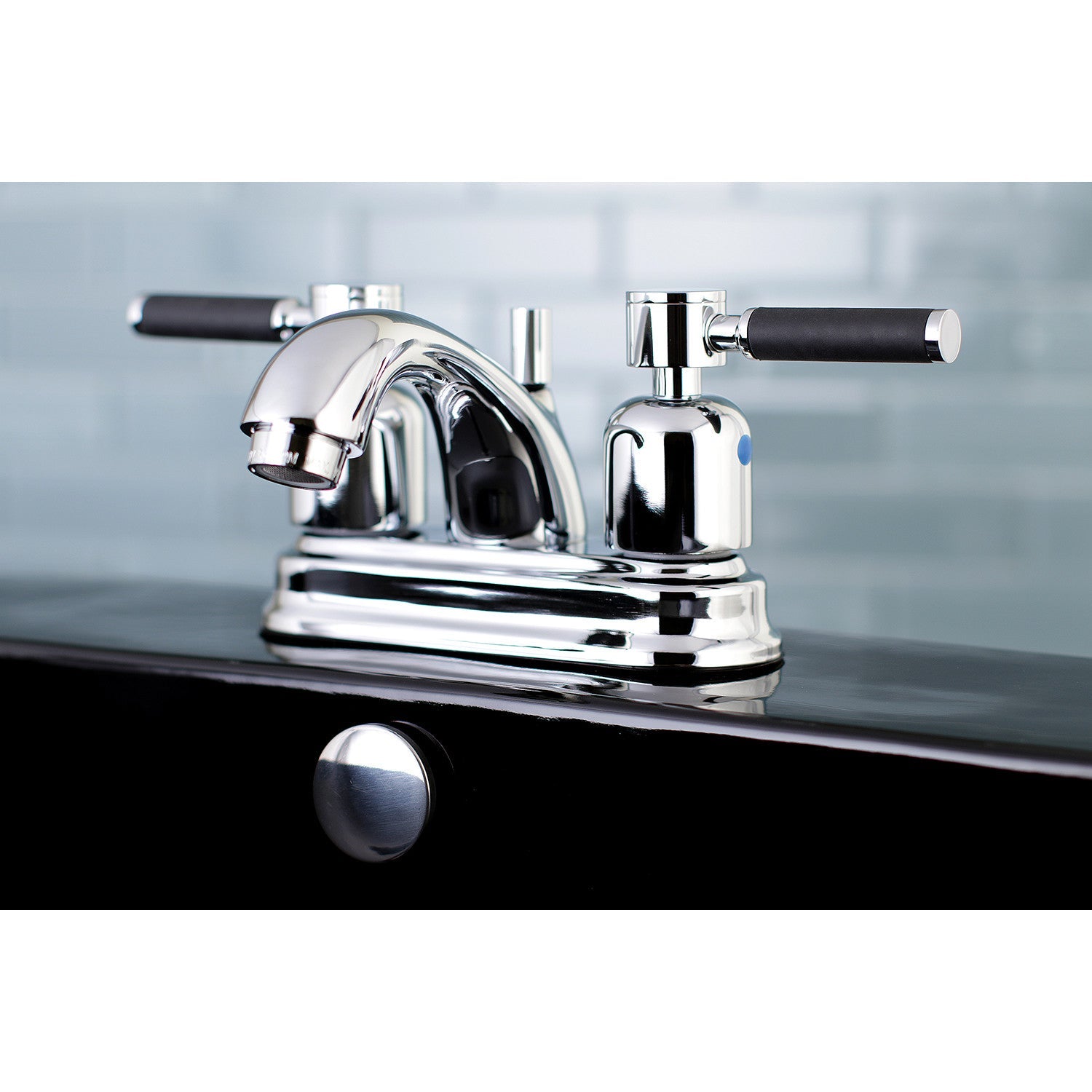 This faucet tastefully interweaves top-notch ergonomic design and the sheen of contemporary simplicity with its black silicone rubber coated handles and cylindrical facets. Centerset bathroom faucets are ideal for smaller bathrooms and feature an easy 3-hole installation. The Kaiser 4-inch centerset bathroom faucet with retail pop-up and its featured sturdy brass construction and premium polished chrome finish are guaranteed to glamorize your home's modern ensemble for years to come. Furnish your home surrounding with the modern flair of this fixture. A matching finish drain is also included.