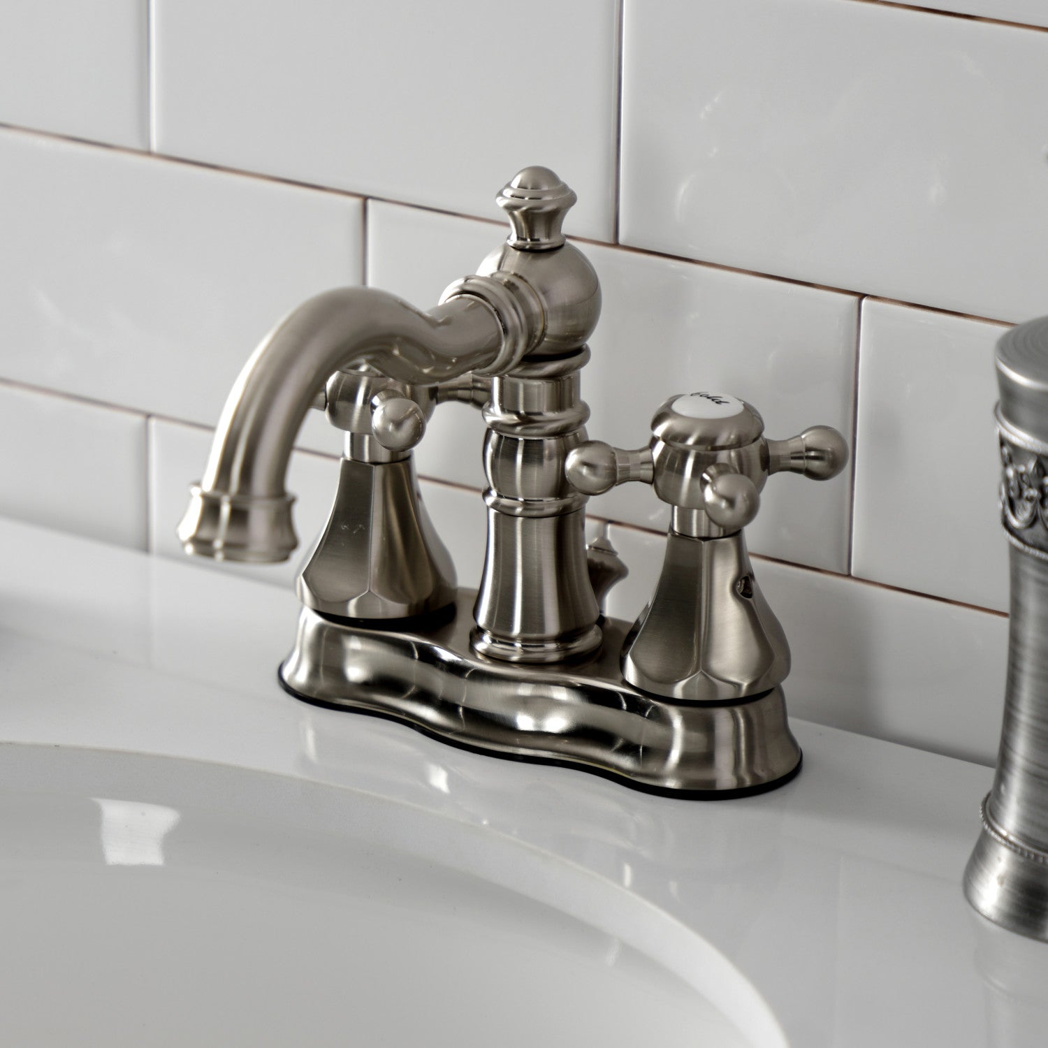 This faucet provides beauty and magnificence with its subtle detailing. Centerset bathroom faucets are ideal for smaller bathrooms and feature an easy 3-hole installation. The Metropolitan 4-inch centerset bathroom faucet with brass pop-up and its featured sturdy brass construction and premium brushed nickel finish are guaranteed to glamorize your home's ensemble for years to come. Luxuriousness and elegance is delivered by the qualities found in this fixture. A matching finish drain is also included.