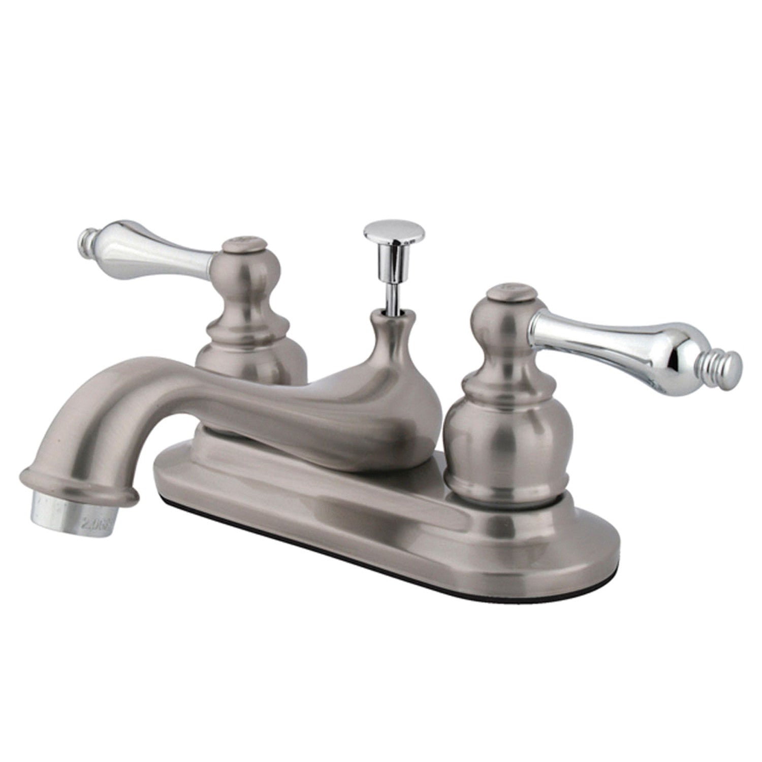 Classical artistry from the late 19th Century to early 20th Century is mirrored beautifully within this faucet's traditional charm. Centerset bathroom faucets are ideal for smaller bathrooms and feature an easy 3-hole installation. The Restoration 4-inch centerset bathroom faucet with retail pop-up and its featured sturdy brass construction and premium brushed nickel/polished chrome finish are guaranteed to glamorize your home's traditional ensemble for years to come. Bring this faucet to your home to offer a touch of old design and exquisite detail. A matching finish drain is also included.