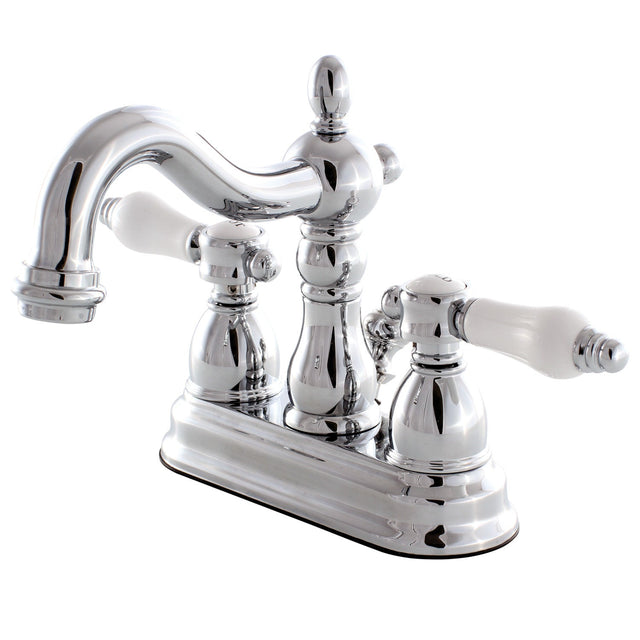 The graceful elegance of timeless design is beautifully merged between British flair and Victorian delicacy within this faucet's white porcelain levers. Centerset bathroom faucets are ideal for smaller bathrooms and feature an easy 3-hole installation. The Bel-Air 4-inch centerset bathroom faucet with retail pop-up and its featured sturdy brass construction and premium polished chrome finish are guaranteed to glamorize your home's traditional ensemble for years to come. Varnish your bathroom with this state-of-the-art fixture. A matching finish drain is also included.