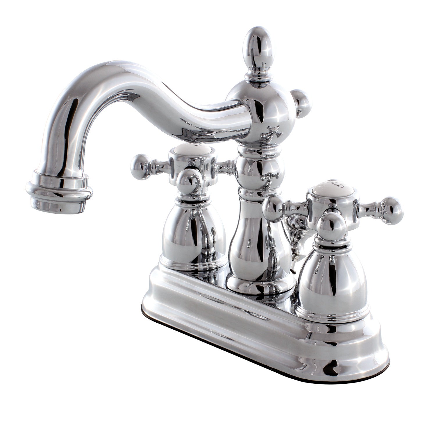 A lavish spark of traditionally stylized glamour is brought to your bathroom ensemble with this beautiful faucet. Centerset bathroom faucets are ideal for smaller bathrooms and feature an easy 3-hole installation. The Heritage 4-inch centerset bathroom faucet with pop-up drain and its featured sturdy brass construction and premium polished chrome finish are guaranteed to glamorize your home's traditional ensemble for years to come. Celebrate sophistication and traditional decor with this statement piece. A matching finish drain is also included.