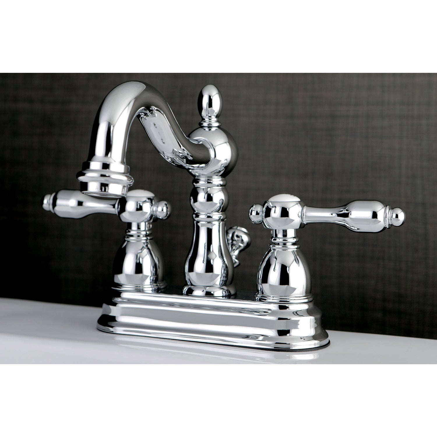 Offering a nod toward the past, this faucet is beautifully inspired by the vintage elegance of mid-19th Century design. Centerset bathroom faucets are ideal for smaller bathrooms and feature an easy 3-hole installation. The Tudor 4-inch centerset bathroom faucet and its featured sturdy brass construction and premium polished chrome finish are guaranteed to glamorize your home's traditional ensemble for years to come. A unique and classically enchanting personality is embodied in this centerpiece. A matching finish drain is also included.