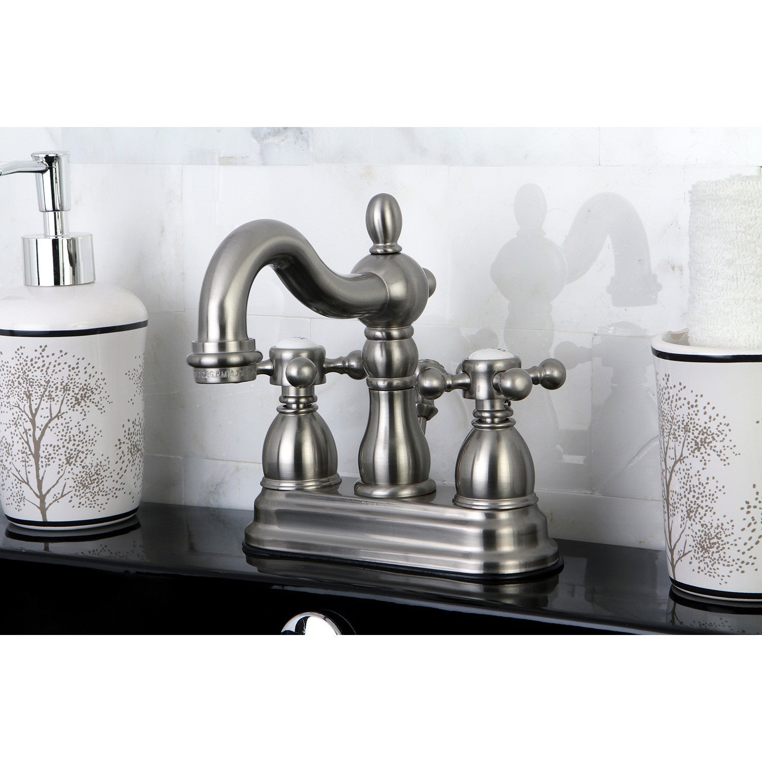 A lavish spark of traditionally stylized glamour is brought to your bathroom ensemble with this beautiful faucet. Centerset bathroom faucets are ideal for smaller bathrooms and feature an easy 3-hole installation. The Heritage 4-inch centerset bathroom faucet with pop-up drain and its featured sturdy brass construction and premium brushed nickel finish are guaranteed to glamorize your home's traditional ensemble for years to come. Celebrate sophistication and traditional decor with this statement piece. A matching finish drain is also included.