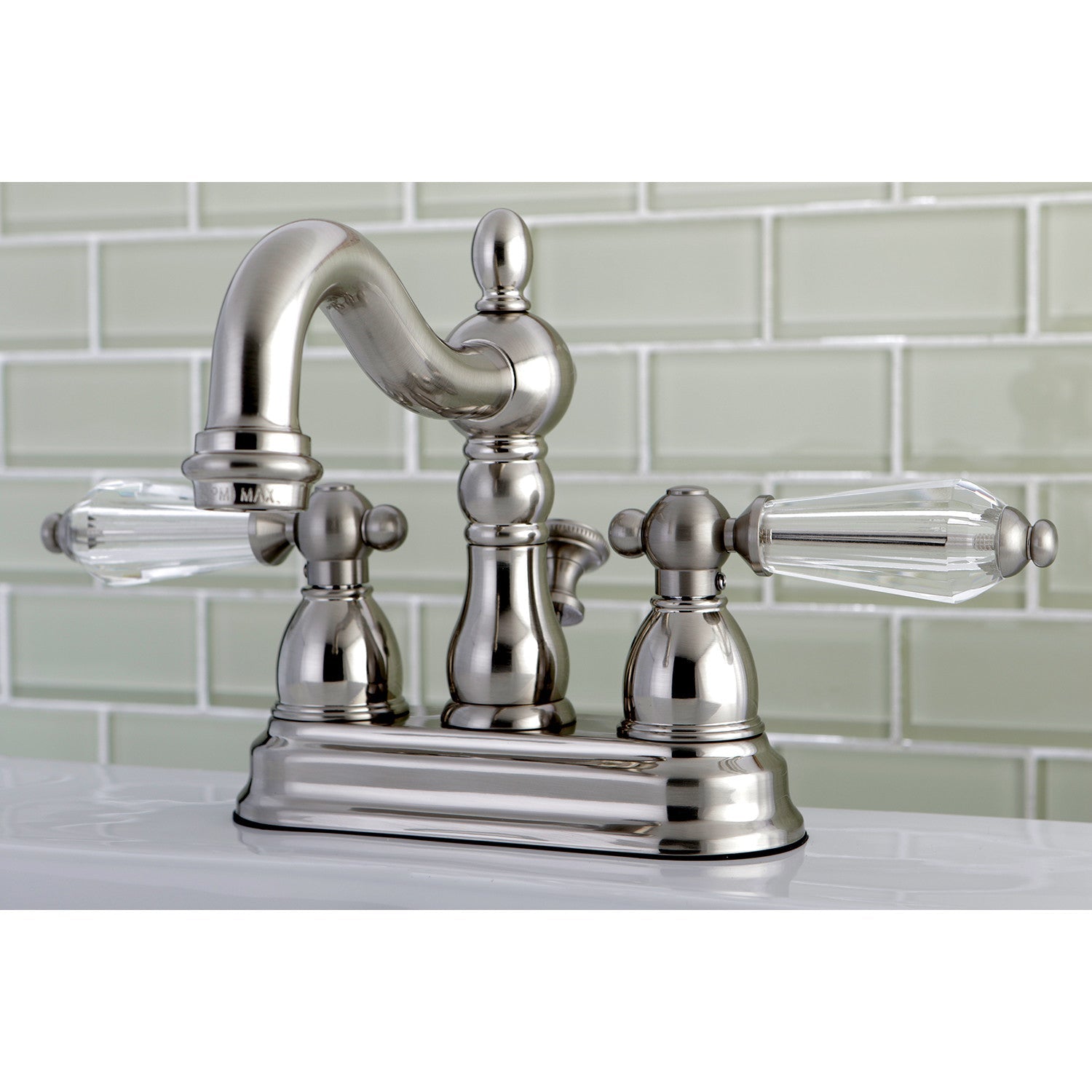 English historical splendor finds itself standing with stunning dignity in the prevalence of the refined acrylic lever handles of this faucet. Centerset bathroom faucets are ideal for smaller bathrooms and feature an easy 3-hole installation. The Wilshire 4-inch centerset bathroom faucet with retail pop-up and its featured sturdy brass construction and premium brushed nickel finish are guaranteed to glamorize your home's traditional ensemble for years to come. Inspire an atmosphere of classical grandeur with the unique appeal of timeless designs with this statement piece. A matching finish drain is also included.