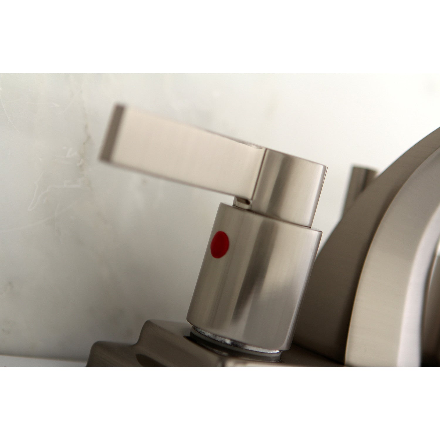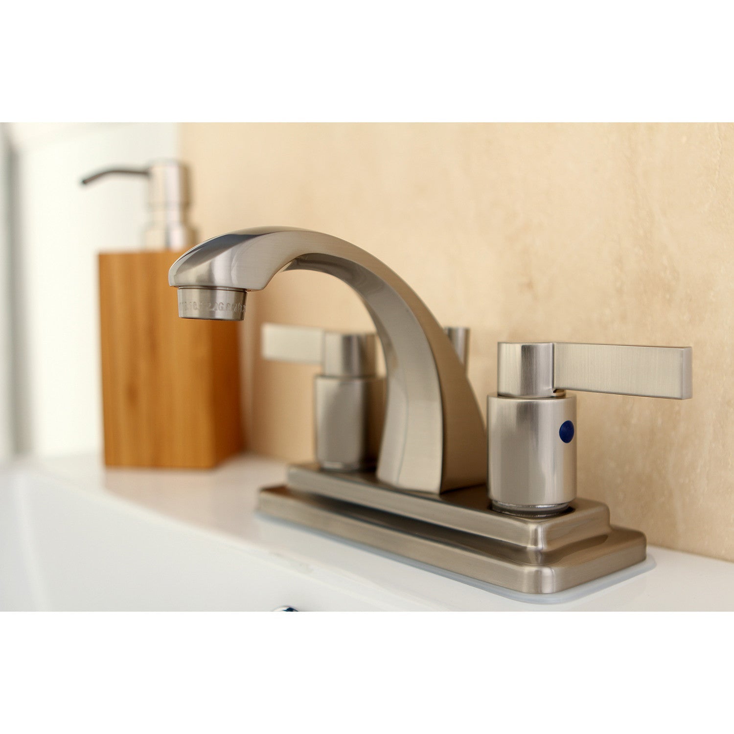 The chic fashion of this faucet is distinguished by its expressive artistry and flat, ergonomic levers. The NuvoFusion 4-inch centerset bathroom faucet and its featured sturdy brass construction and premium brushed nickel finish are guaranteed to glamorize your home's modern ensemble for years to come. Centerset bathroom faucets are ideal for smaller bathrooms and feature an easy 3-hole installation. Revive the obsolete with the illustrious prestige of this fixture. A matching finish drain is also included.