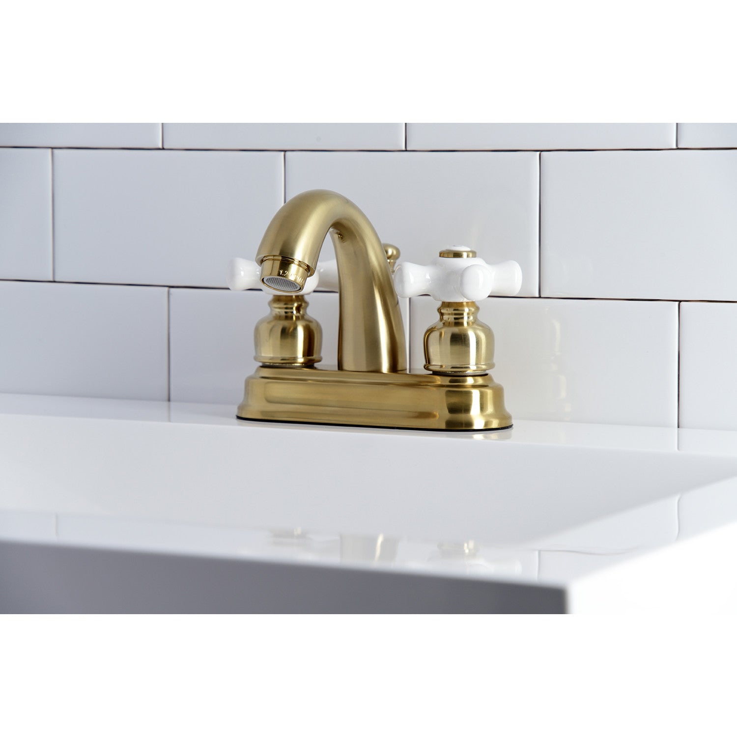 Restoration KB5617PX Two-Handle 3-Hole Deck Mount 4" Centerset Bathroom Faucet with Plastic Pop-Up, Brushed Brass