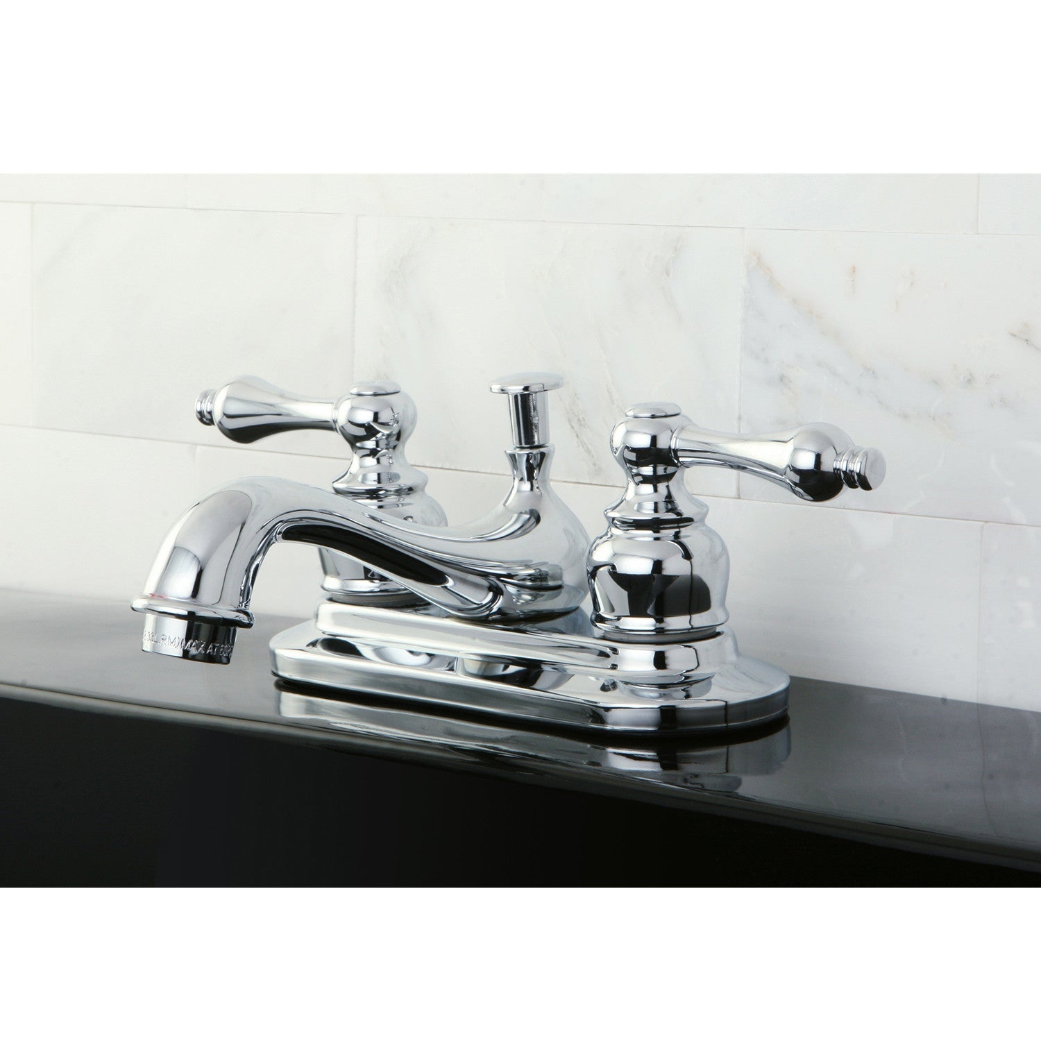 Restoration KB601AL Two-Handle 3-Hole Deck Mount 4" Centerset Bathroom Faucet with Plastic Pop-Up, Polished Chrome
