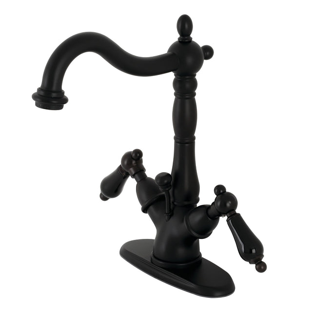 Crafted in commendations to English nobility, the exemplary design of this faucet manifests regality and elegance with its black porcelain handles. Single-hole bathroom faucets with optional deck plates are ideal for smaller bathrooms and feature an easy 1 or 3-hole installation. Remove the deck plate for an ease of cleaning and more streamlined design. The Duchess two-handle bathroom faucet with brass pop-up and cover plate and its featured sturdy brass construction and premium matte black finish are guaranteed to glamorize your home's ensemble for years to come. Glamorize your home today with the traditional elegance of this faucet. A matching finish drain is also included.