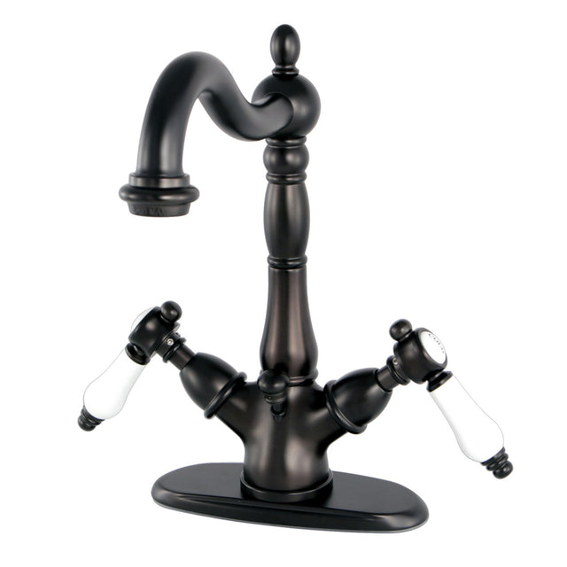 The graceful elegance of timeless design is beautifully merged between British flair and Victorian delicacy within this faucet's white porcelain levers. Single-hole bathroom faucets with optional deck plates are ideal for smaller bathrooms and feature an easy 1 or 3-hole installation. Remove the deck plate for an ease of cleaning and more streamlined design. The Bel-Air two-handle bathroom faucet with brass pop-up and cover plate and its featured sturdy brass construction and premium oil rubbed bronze finish are guaranteed to glamorize your home's traditional ensemble for years to come. Varnish your bathroom with this state-of-the-art fixture. A matching finish drain is also included.