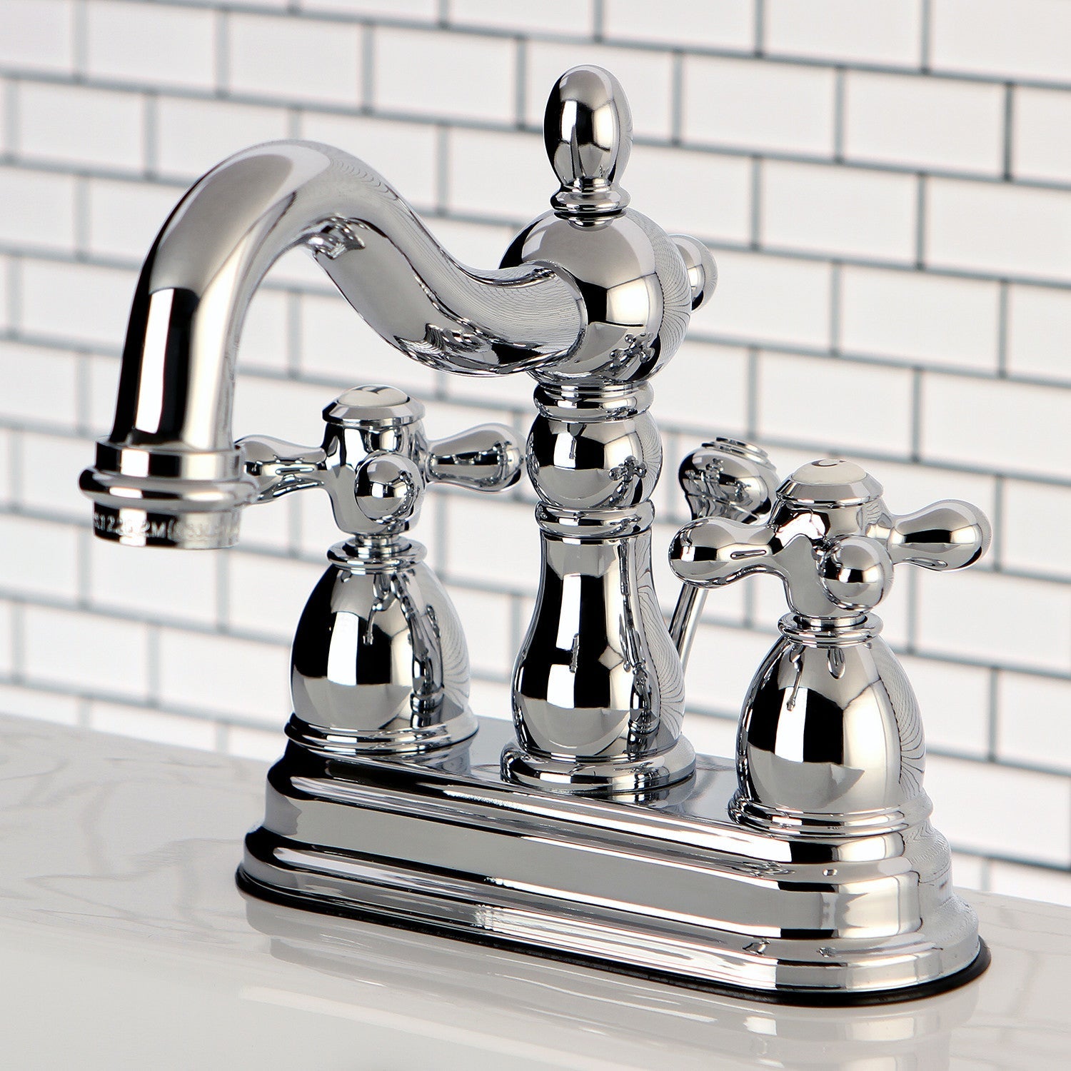 A lavish spark of traditionally stylized glamour is brought to your bathroom ensemble with this beautiful faucet. Centerset bathroom faucets are ideal for smaller bathrooms and feature an easy 3-hole installation. The Heritage 4-inch centerset bathroom faucet and its featured sturdy brass construction and premium polished chrome finish are guaranteed to glamorize your home's traditional ensemble for years to come. Celebrate sophistication and traditional decor with this statement piece. A matching finish drain is also included.