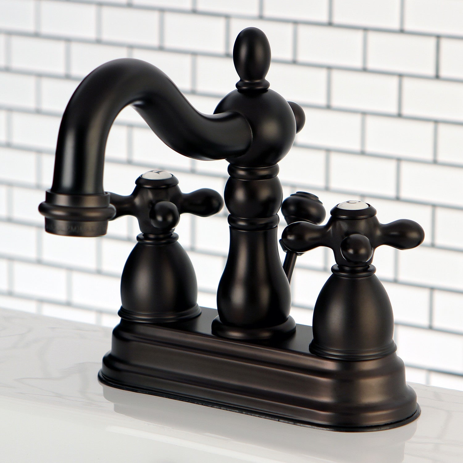 A lavish spark of traditionally stylized glamour is brought to your bathroom ensemble with this beautiful faucet. Centerset bathroom faucets are ideal for smaller bathrooms and feature an easy 3-hole installation. The Heritage 4-inch centerset bathroom faucet and its featured sturdy brass construction and premium oil rubbed bronze finish are guaranteed to glamorize your home's traditional ensemble for years to come. Celebrate sophistication and traditional decor with this statement piece. A matching finish drain is also included.