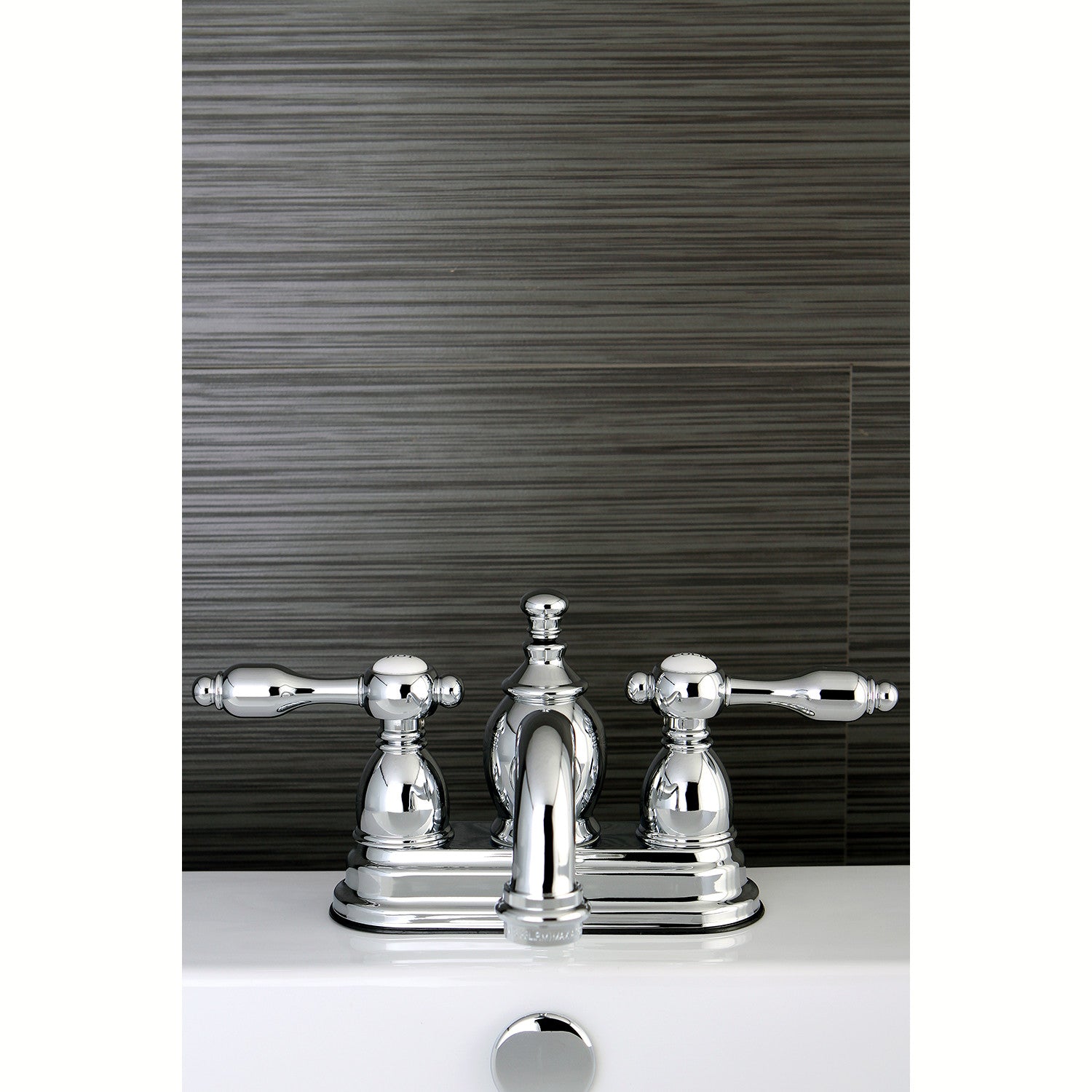Offering a nod toward the past, this faucet is beautifully inspired by the vintage elegance of mid-19th Century design. Centerset bathroom faucets are ideal for smaller bathrooms and feature an easy 3-hole installation. The Tudor 4-inch centerset bathroom faucet with brass pop-up and its featured sturdy brass construction and premium polished chrome finish are guaranteed to glamorize your home's traditional ensemble for years to come. A unique and classically enchanting personality is embodied in this centerpiece. A matching finish drain is also included.