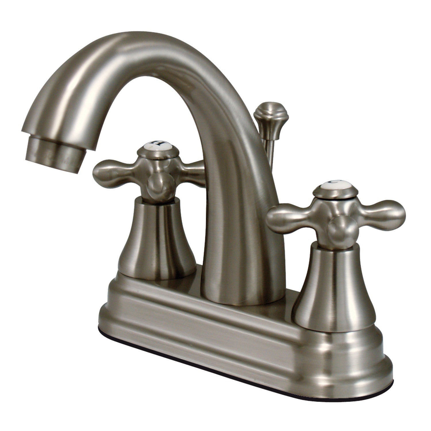 Honor the refinement of antiquated traditional European craftsmanship with this faucet. Centerset bathroom faucets are ideal for smaller bathrooms and feature an easy 3-hole installation. The English Vintage 4-inch centerset bathroom faucet with brass pop-up and its featured sturdy brass construction and premium brushed nickel finish are guaranteed to glamorize your home's traditional ensemble for years to come. This faucet will surely raise praise and admiration for its unique aesthetic. A matching finish drain is also included.