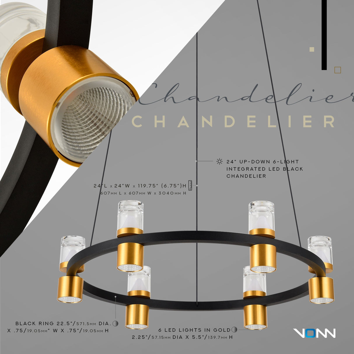 VONN Artisan Ellegi VMC34224BL 24" Integrated LED ETL Certified Pendant, Height Adjustable Chandelier, Black