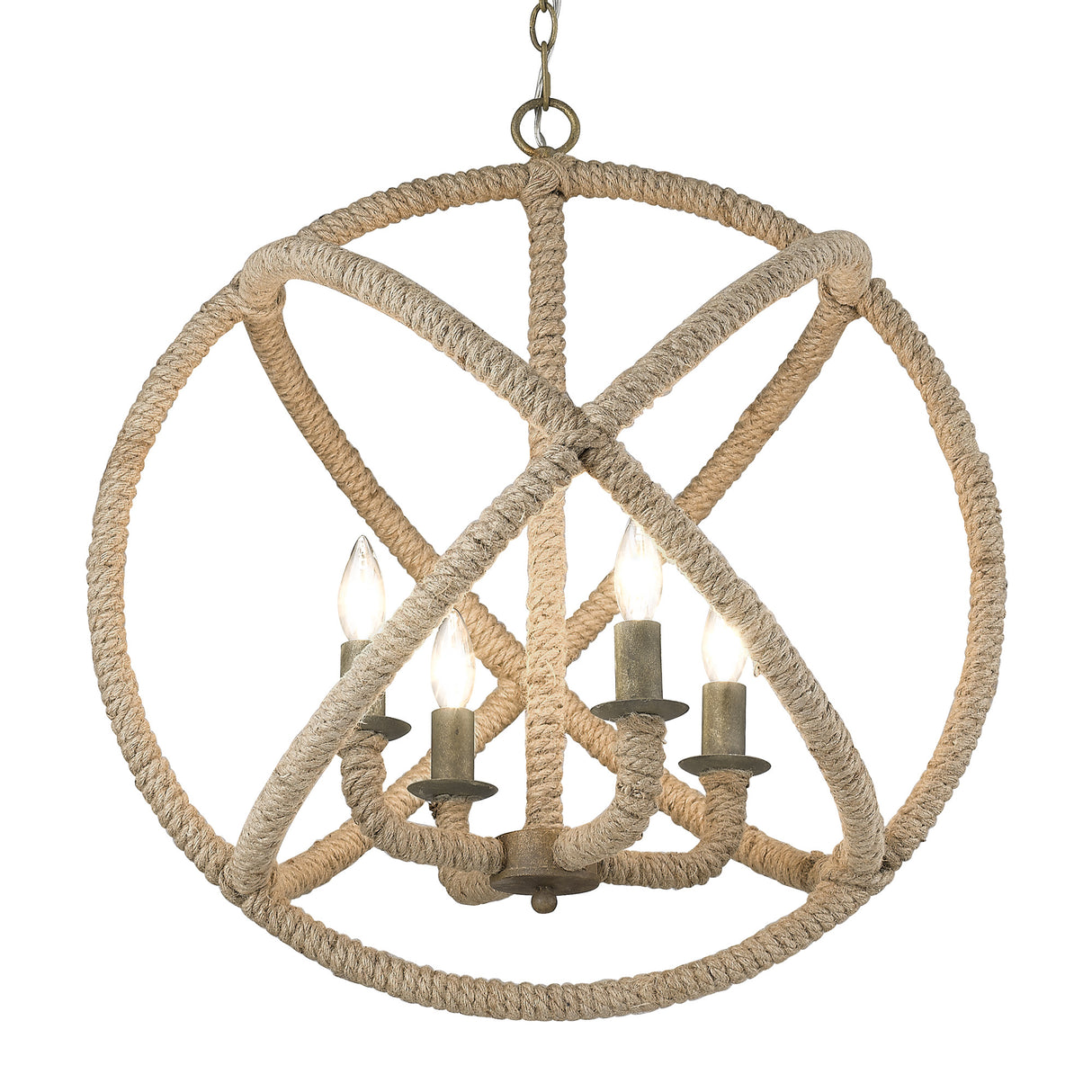 The Marina Collection features cozy spherical fixtures. This four-light chandelier is finished in Burnished Chestnut and then wrapped in authentic rope. The trendy mix of these materials gives the chandelier the warmth of coordinating browns to pull your cozy room together. Chandeliers create stylish focal points and this 4-light is comfortably sized for a dining room, living room, or entry.