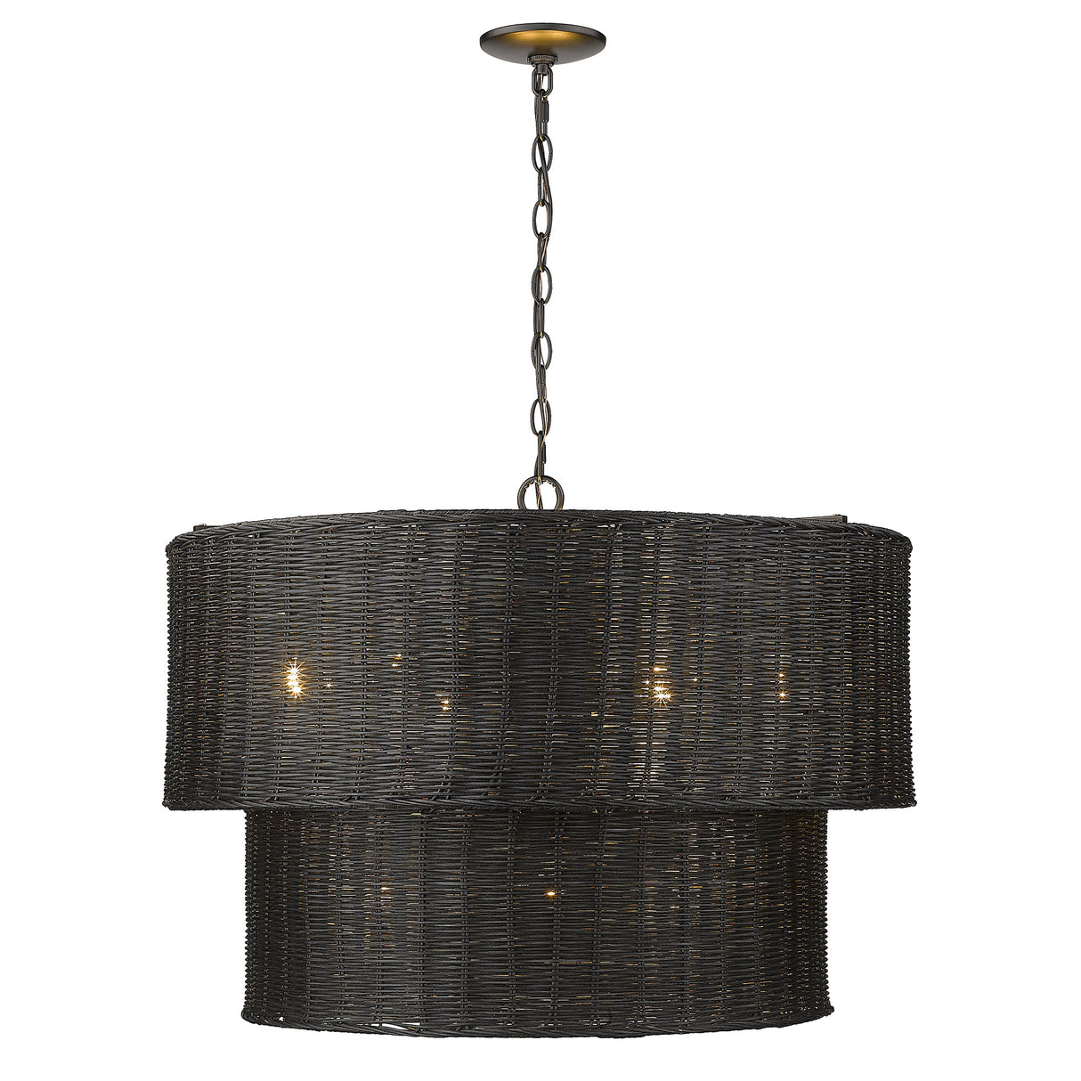 Casual elegance is re-defined in the transitional Erma Collection. This Bohemian-chic series will give your home new life. Offered in multiple silhouettes and finishes, including some two-tier configurations, these textured, airy fixtures are stunning. Carefully crafted of woven wicker over a steel frame, the lights are durable. Create a warm ambiance in any indoor space with these peek-a-boo woven shades. Choose between a casual monochromatic look of Matte Black and Black Wicker or a more upscale look of Brushed Champagne Bronze and White Wicker. Bright light shines from numerous medium-based sockets.