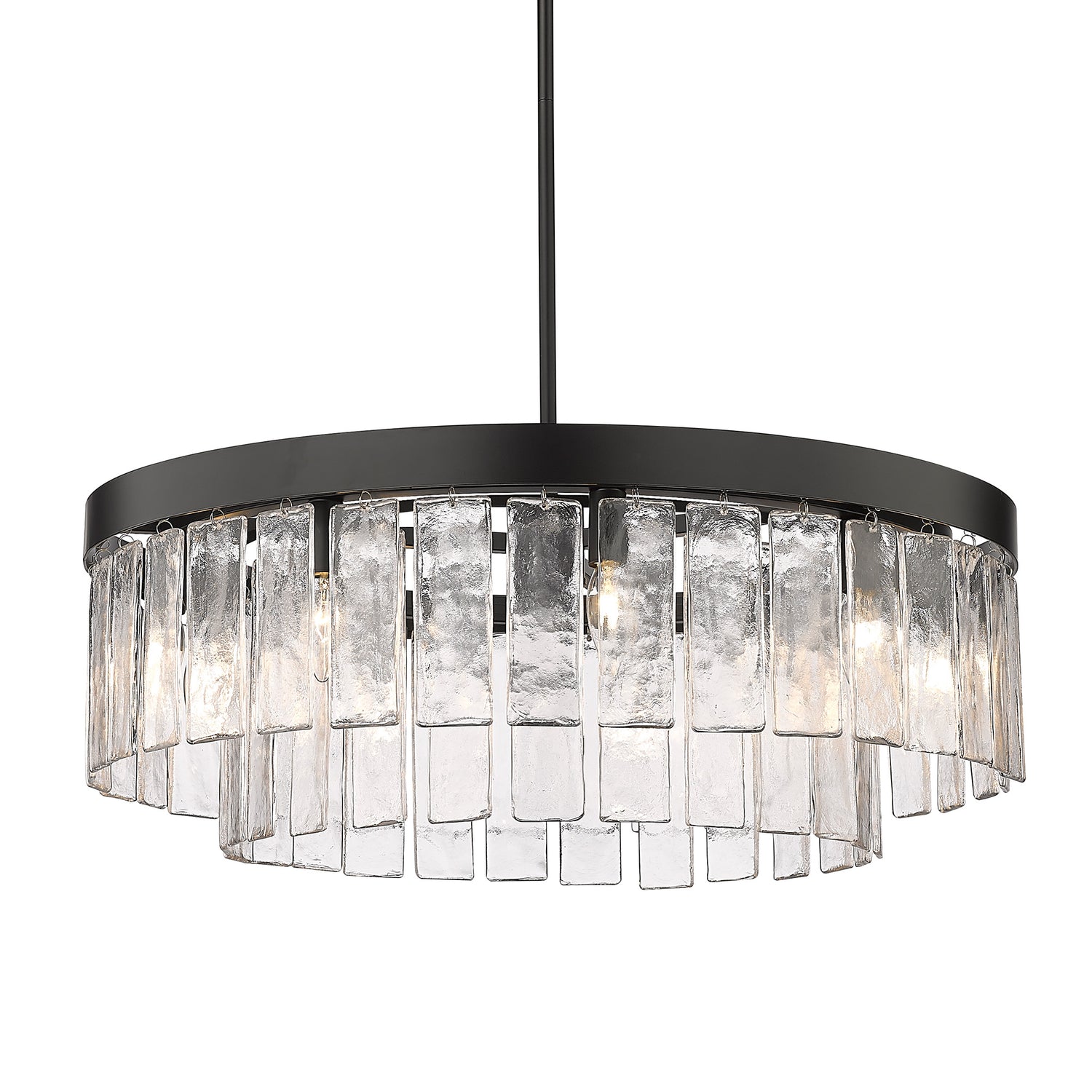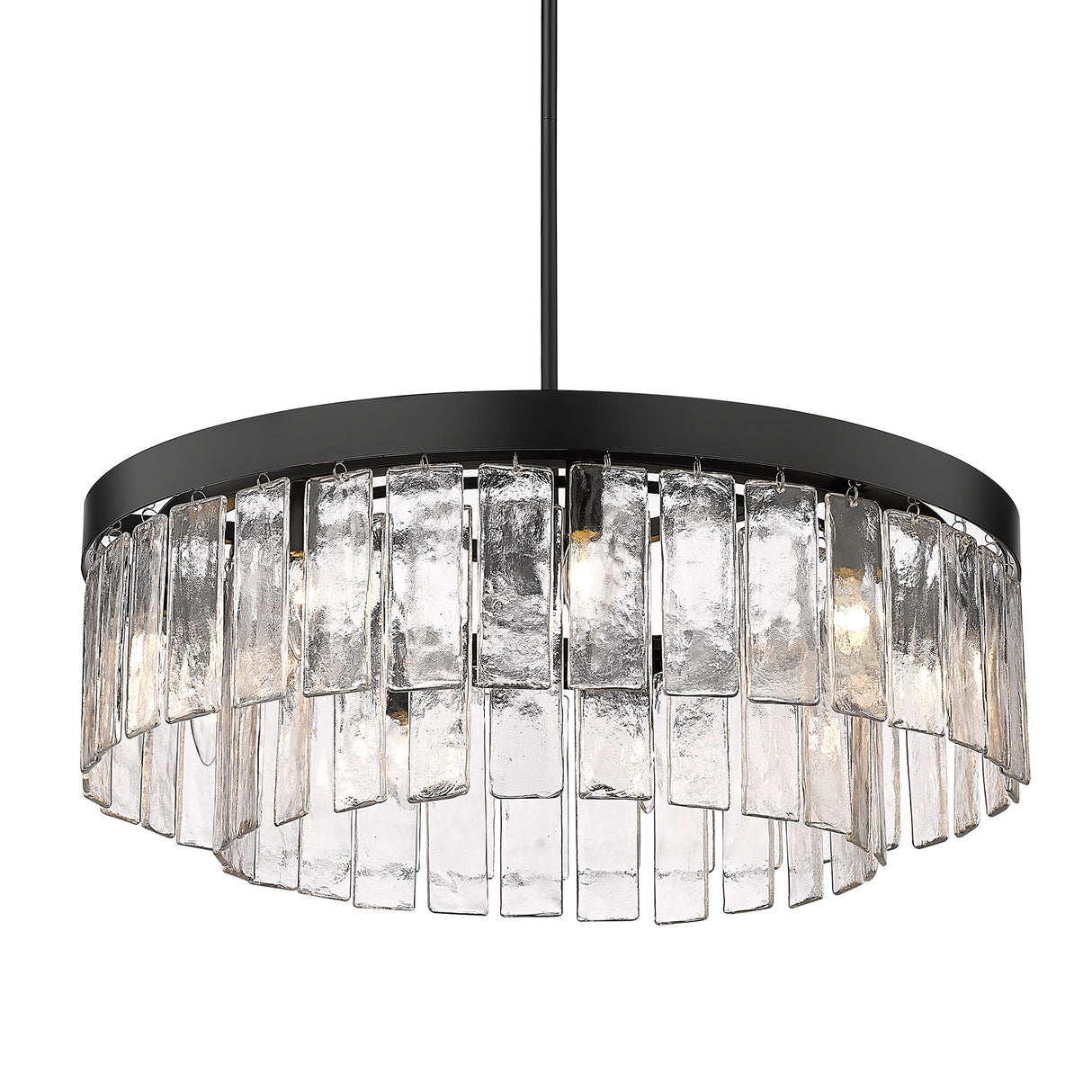 Stunning and dramatic, Ciara is a clean, contemporary design. Like sheets of ice, panels of Hammered Water Glass hang from wide metal hoops. The glass pieces form a layered drum shade enclosing the inner lamps. The diffused light allows admirers to experience the beauty of transparent glass without blinding glare. Choose between two sophisticated finishes: Matte Black and White Gold.