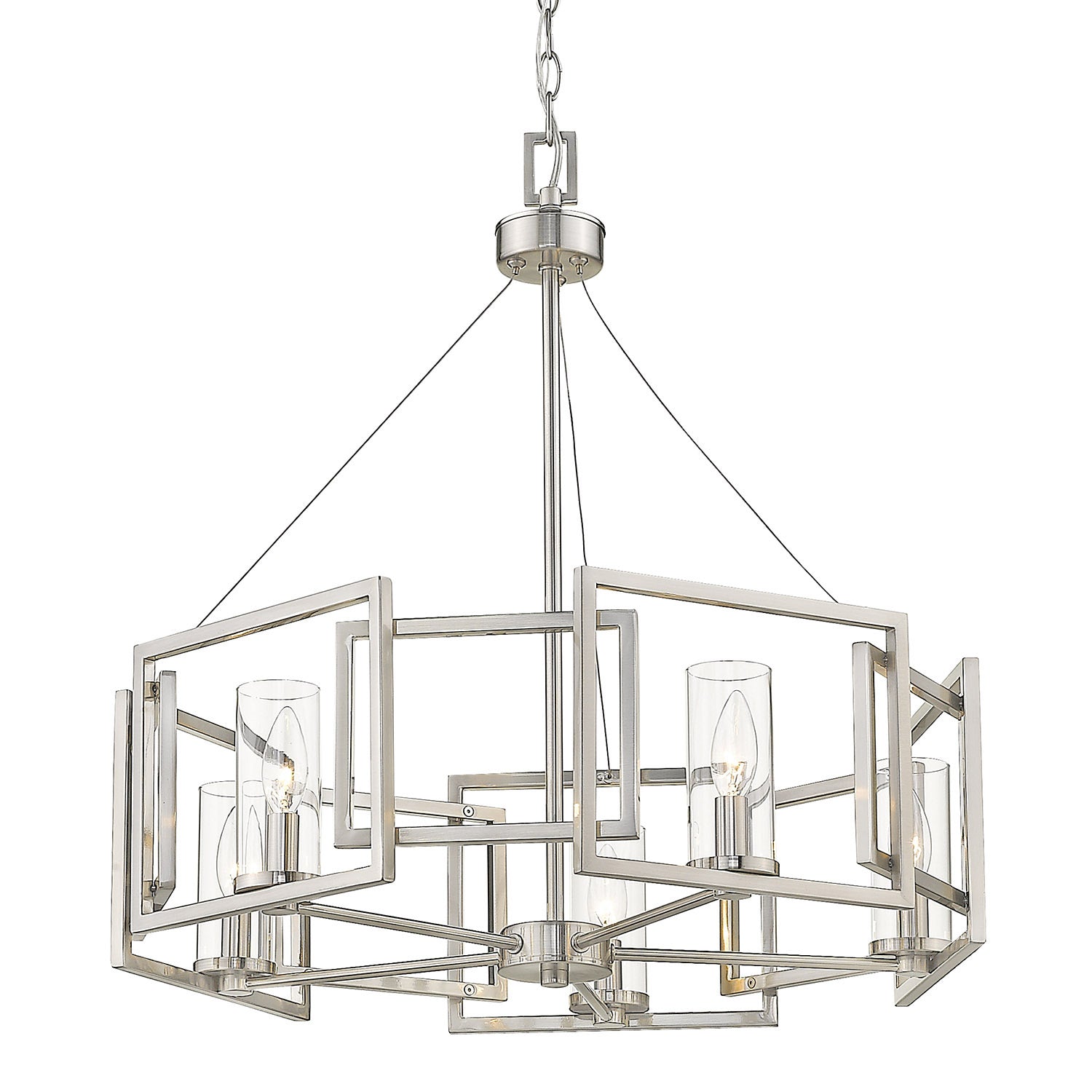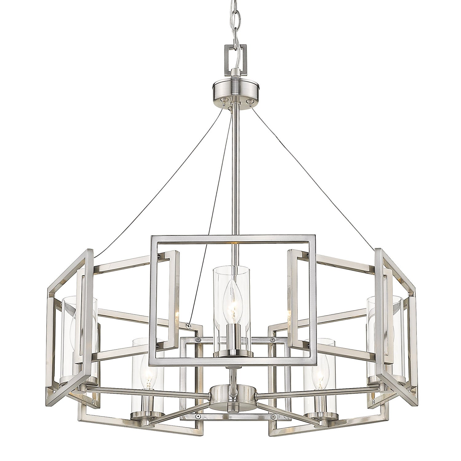 Sleek angles and geometric forms make ultra-modern statements in the Marco collection. The series is offered in multiple finishes that heighten the light airy look of the silhouettes. Clear glass cylinders house stately candelabra bulbs.