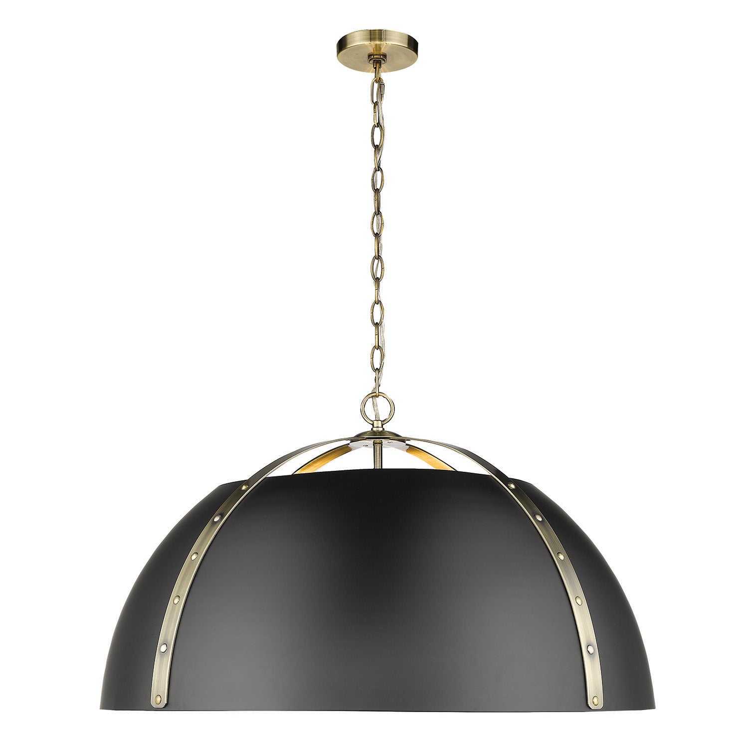 Finally, fashion meets function in a refined, oversized dome pendant with the ability to cast ample light. Aldrich is a stylish collection of industrial-inspired pendants designed to push bright ambient and task light through the tops and bottoms of metal shades. Heavy-duty rivets provide aesthetic appeal and utility, securing the matching wide steel straps to the coordinating shade. Created to complement a wide variety of interior styles, from modern to rustic, these pendants are available in multiple finish combinations. The frame is offered in multiple finishes with a selection of different shades to complete the look. This 8-light pendant is graciously sized for large rooms.