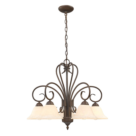 Regular price $21500UnavailableIn stock online (18 Units)Homestead 5 Light Nook Chandelier in Rubbed Bronze with Tea Stone Glass