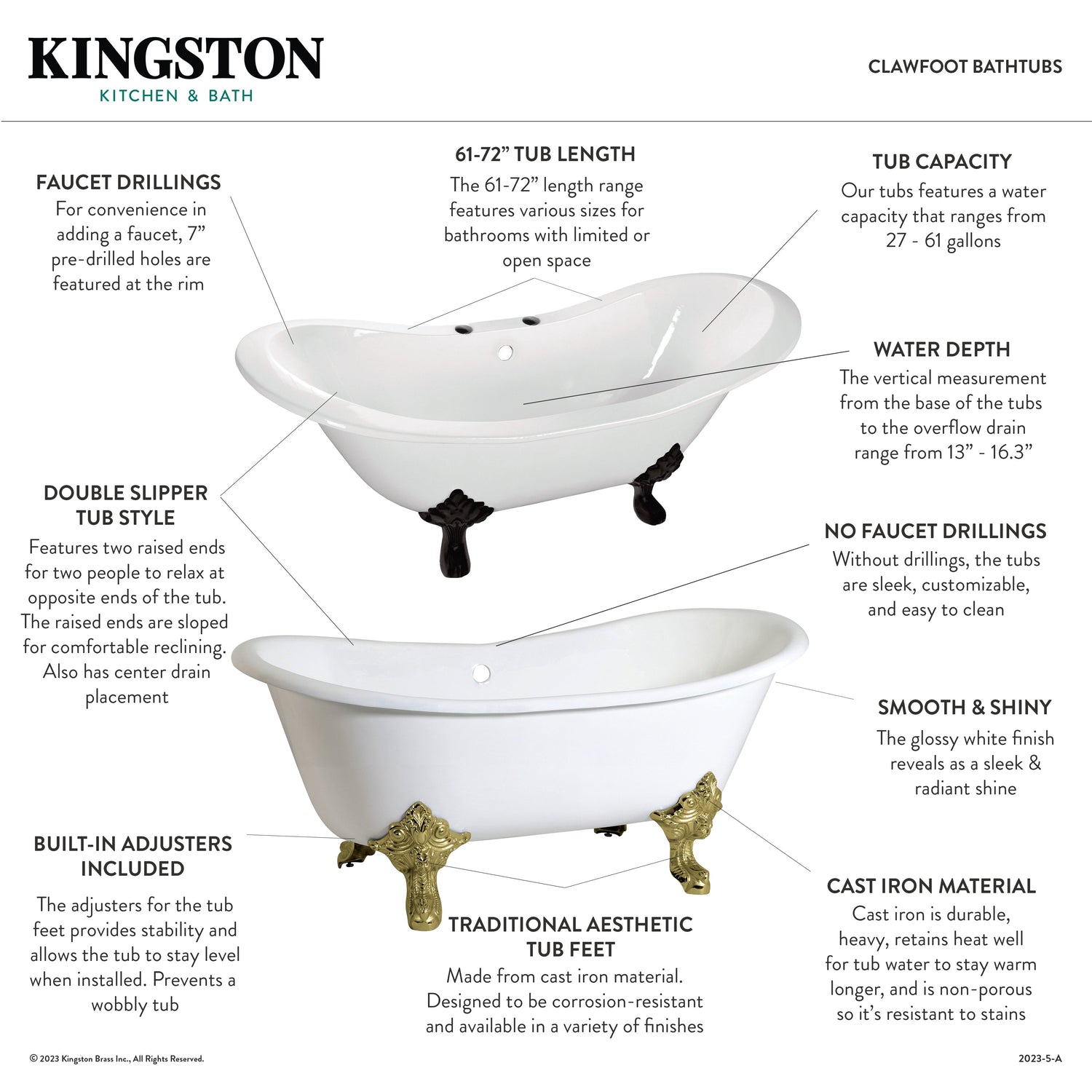 Surround yourself with the perfumed aroma of your favorite candle, grab your favorite piece of literature, and soak all of the stresses of the day away with the all-encompassing embrace of one of Kingston Brass' finest products, the clawfoot tub. Since the late 19th century, the claw foot tub has stood prominent among bathroom fixtures for its outstanding grandeur. The Aqua Eden 67-inch cast iron double slipper clawfoot tub (without faucet drillings) will wholly beautify your home for years to come thanks to its durable and heavy cast iron construction. Elegantly crafted clawfoot tub feet are included to further elevate your home's traditional eminence. Aside from its feet, this bathtub is enameled in glossy white for a classic look, exceptional durability, and easy care and maintenance for years to come.