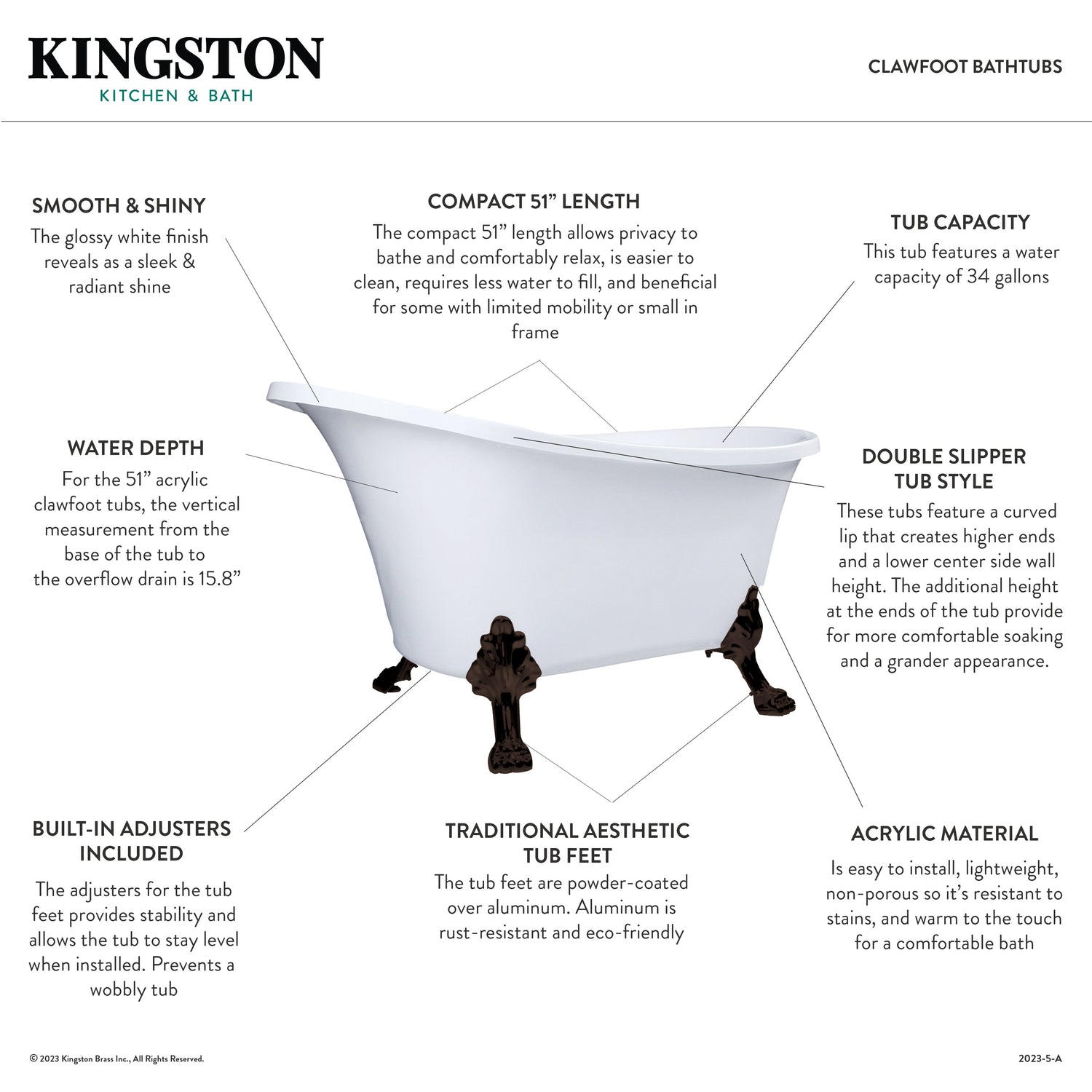 Surround yourself with the perfumed aroma of your favorite candle, grab your favorite piece of literature, and soak all of the stresses of the day away with the all-encompassing embrace of one of Kingston Brass' finest products, the clawfoot tub. Since the late 19th century, the claw foot tub has stood prominent among bathroom fixtures for its outstanding grandeur. The 51-inch acrylic clawfoot tub will wholly beautify your home for years to come thanks to its durable and easily repairable acrylic construction. Elegantly crafted clawfoot tub feet are included to further elevate your home's traditional eminence. Aside from its feet, this bathtub is finished inside and out in a brilliant, high-gloss white that ensures crisp aesthetics and easy care now and well in the future.