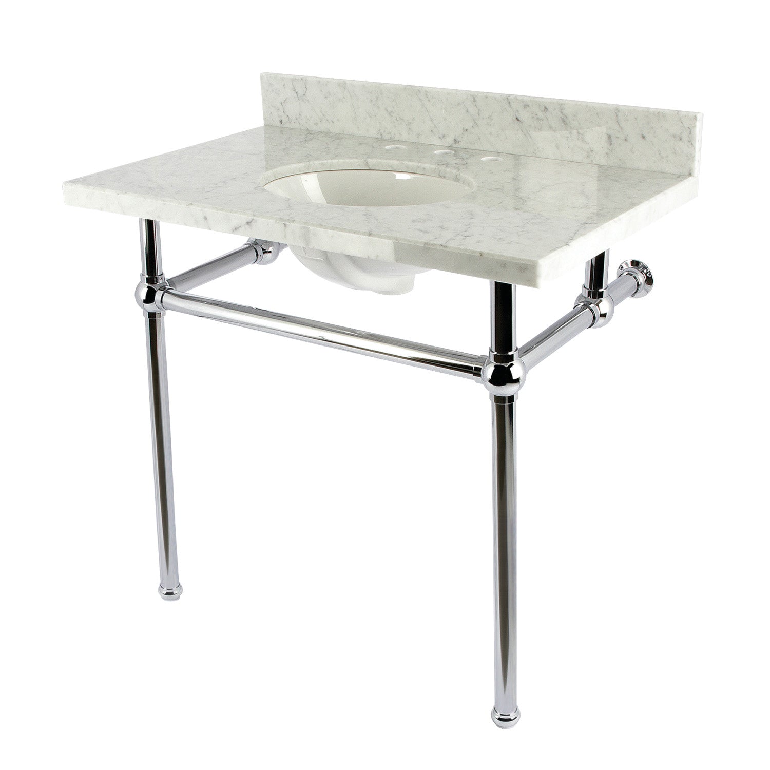 With a beautiful 36-inch carrara marble counter top, this console sink set is a long lasting, durable, and elegant addition to your bathroom. A fabulous alternative where space is limited or tight, making them friendly for the whole family. With different shades and natural designs, otherwise known as veining, no two sinks will be alike. Also for your convenience, anti-slip rubber pads are included with the brass legs to ensure steadiness. Water supply kit, drain assembly, and the faucet are sold separately. Kingston's carrara marble tops are polished, but they are not sealed. Polished marble has a shiny surface and resists stains. Natural stone, even when polished, is still somewhat porous and does remain susceptible to etching by acidic compounds like fruit juice, vinegar, some cleaning solvents, etc. For customers that wish to further protect their investment the marble can be sealed. The following is intended solely for informational purposes. Kingston does not warranty nor accept liability for damages or other negative outcomes resulting from any treatment or coating applied to the countertop after purchase, whether applied by the customer or by a third party. For anyone unfamiliar with this nature of project, Kingston recommends consulting an experienced professional in your area. When looking for a sealant product, please be sure to seek a product specifically designed for use on polished marble, granite or other natural stone surfaces. Be sure to always avoid anything containing a citrus ingredient, acid ingredient, tung oil, linseed oil, or other natural oils. These can damage or discolor your marble.