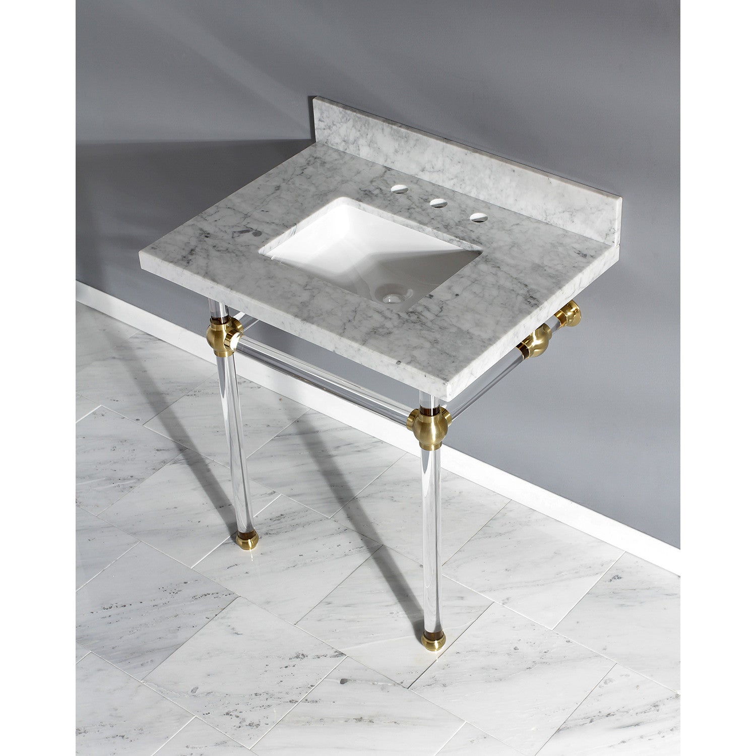 Fauceture KVPB3030MASQ7 30-Inch Marble Console Sink with Acrylic Feet, Carrara Marble/Brushed Brass