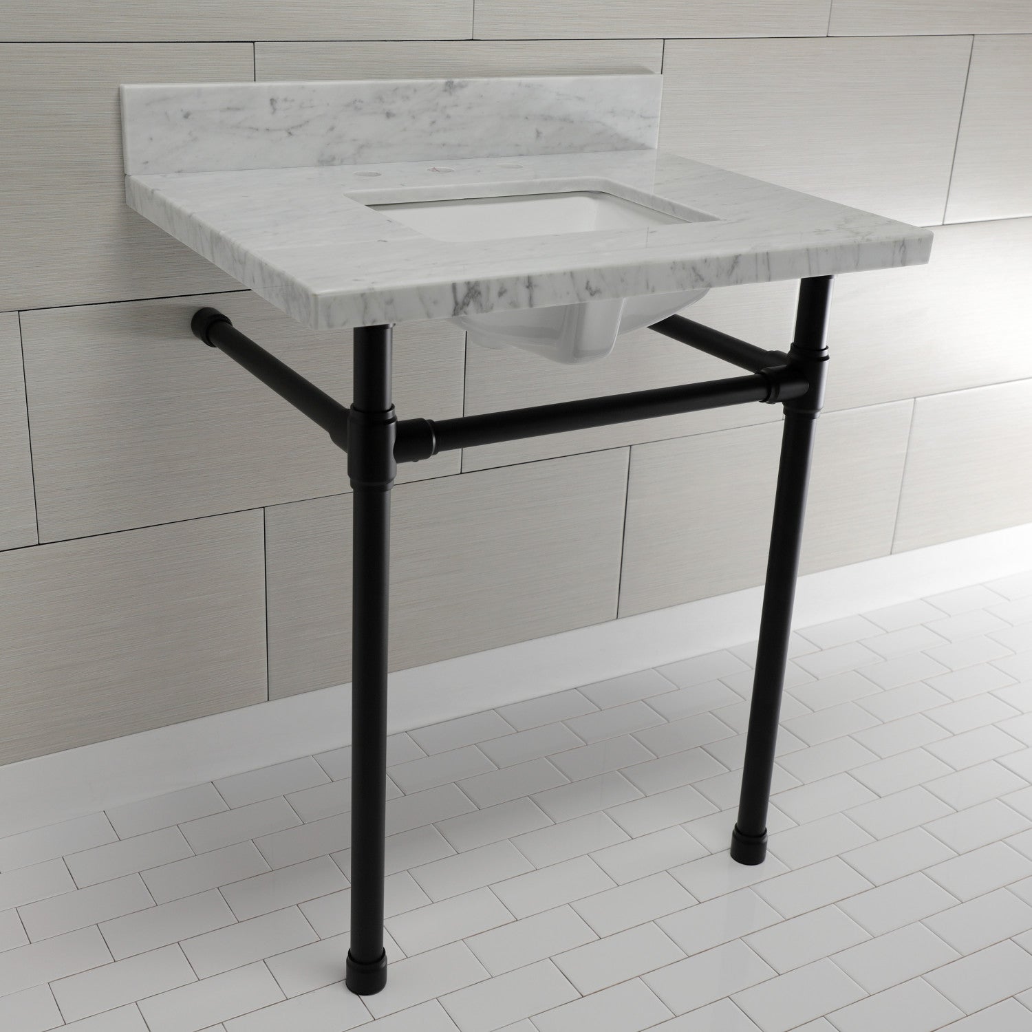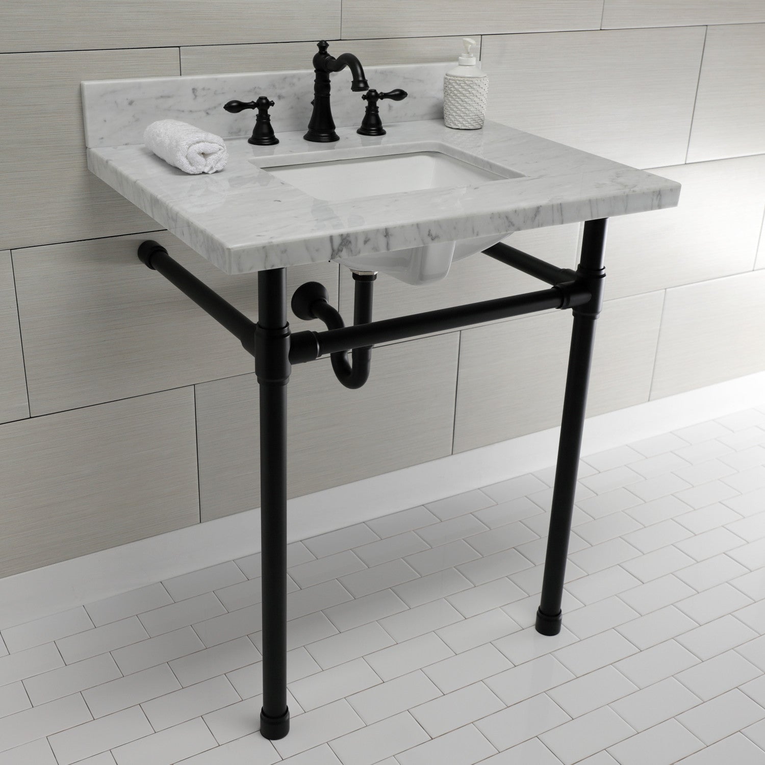 With a beautiful Carrara marble counter top, this console sink set is a long lasting, durable, and elegant addition to your bathroom. A fabulous alternative where space is limited or tight, making them friendly for the whole family. With different shades and natural designs, otherwise known as veining, no two sinks will be alike. Also for your convenience, anti-slip rubber pads are included with the stainless steel legs to ensure steadiness. Water supply kit, drain assembly, and the faucet are sold separately. Kingston's carrara marble tops are polished, but they are not sealed. Polished marble has a shiny surface and resists stains. Natural stone, even when polished, is still somewhat porous and does remain susceptible to etching by acidic compounds like fruit juice, vinegar, some cleaning solvents, etc. For customers that wish to further protect their investment the marble can be sealed. The following is intended solely for informational purposes. Kingston does not warranty nor accept liability for damages or other negative outcomes resulting from any treatment or coating applied to the countertop after purchase, whether applied by the customer or by a third party. For anyone unfamiliar with this nature of project, Kingston recommends consulting an experienced professional in your area. When looking for a sealant product, please be sure to seek a product specifically designed for use on polished marble, granite or other natural stone surfaces. Be sure to always avoid anything containing a citrus ingredient, acid ingredient, tung oil, linseed oil, or other natural oils. These can damage or discolor your marble.