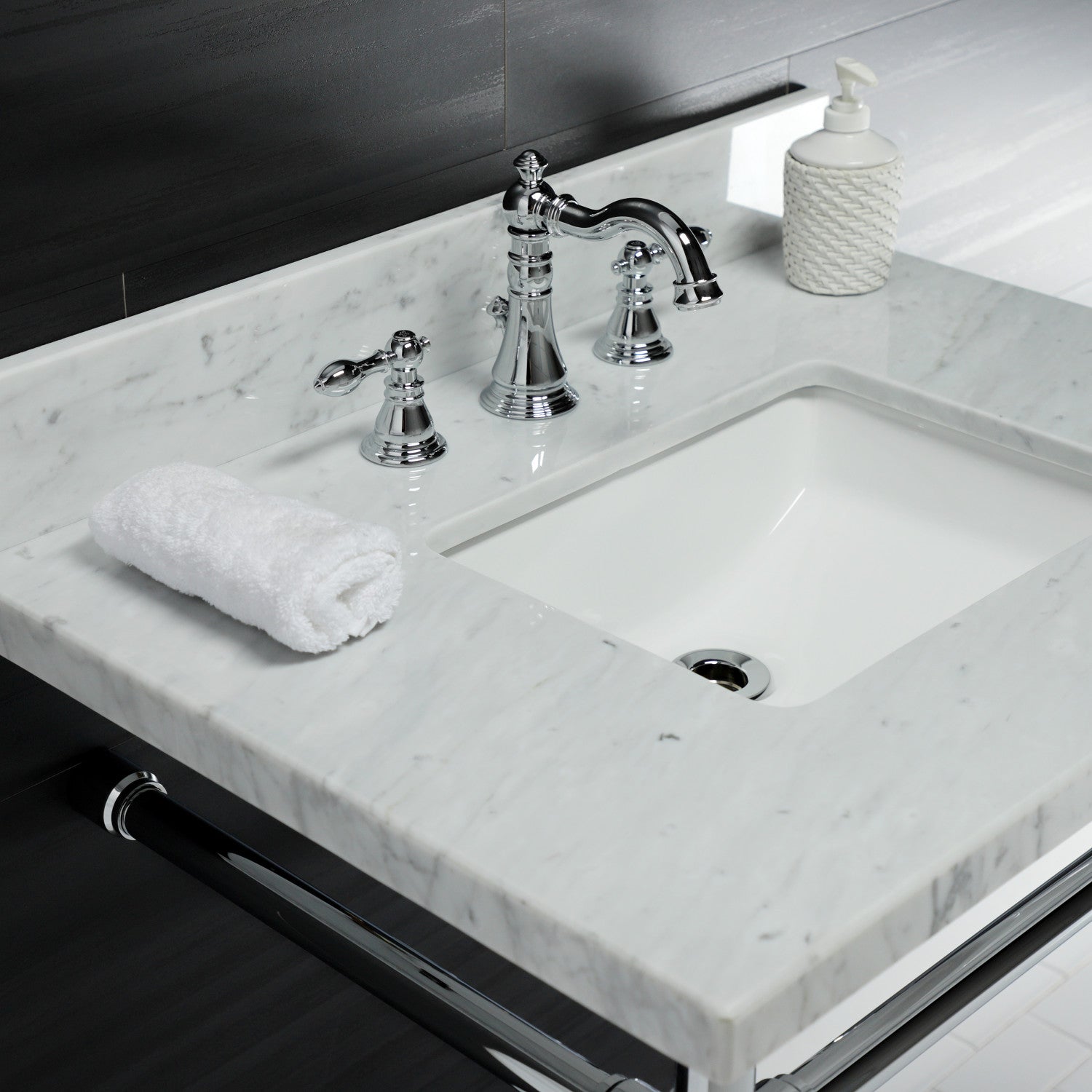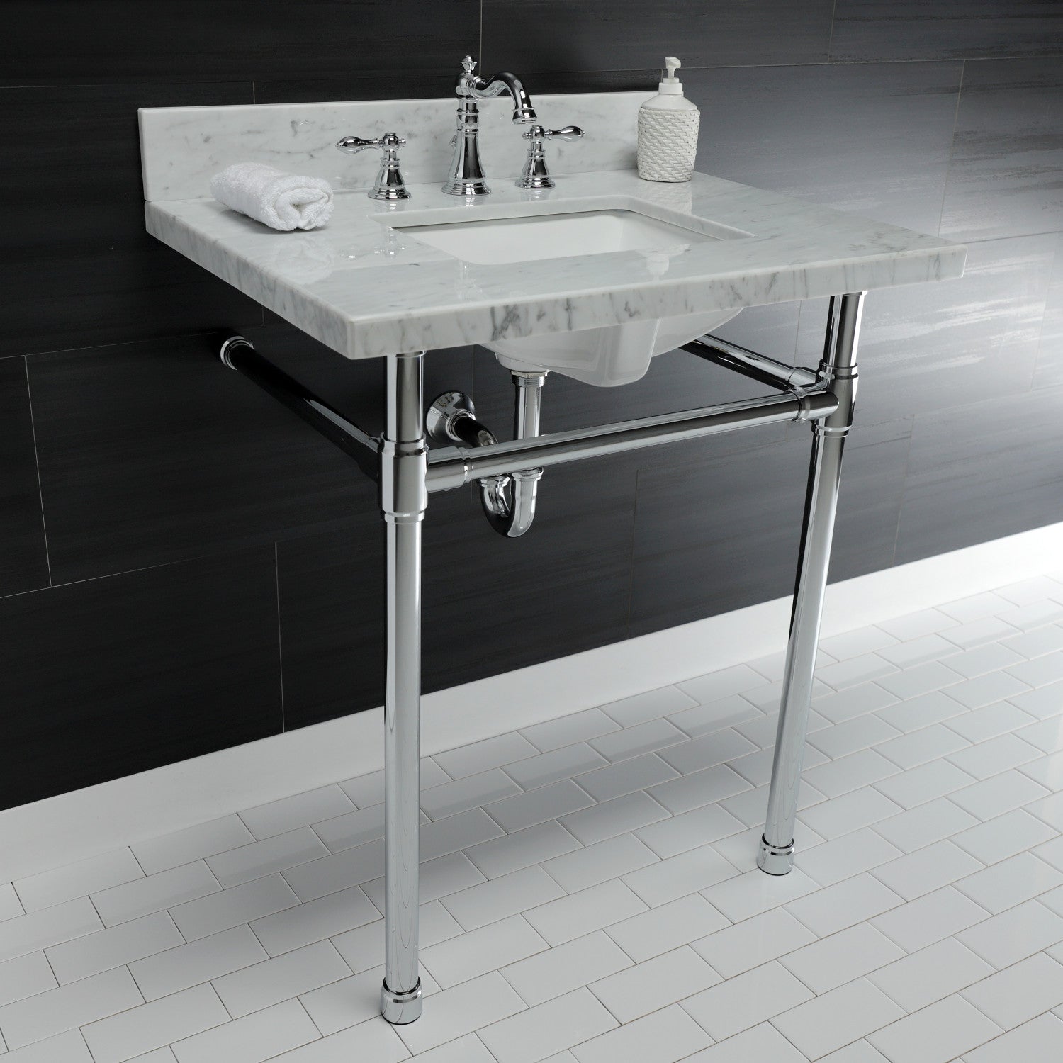 With a beautiful Carrara marble counter top, this console sink set is a long lasting, durable, and elegant addition to your bathroom. A fabulous alternative where space is limited or tight, making them friendly for the whole family. With different shades and natural designs, otherwise known as veining, no two sinks will be alike. Also for your convenience, anti-slip rubber pads are included with the stainless steel legs to ensure steadiness. Water supply kit, drain assembly, and the faucet are sold separately. Kingston's carrara marble tops are polished, but they are not sealed. Polished marble has a shiny surface and resists stains. Natural stone, even when polished, is still somewhat porous and does remain susceptible to etching by acidic compounds like fruit juice, vinegar, some cleaning solvents, etc. For customers that wish to further protect their investment the marble can be sealed. The following is intended solely for informational purposes. Kingston does not warranty nor accept liability for damages or other negative outcomes resulting from any treatment or coating applied to the countertop after purchase, whether applied by the customer or by a third party. For anyone unfamiliar with this nature of project, Kingston recommends consulting an experienced professional in your area. When looking for a sealant product, please be sure to seek a product specifically designed for use on polished marble, granite or other natural stone surfaces. Be sure to always avoid anything containing a citrus ingredient, acid ingredient, tung oil, linseed oil, or other natural oils. These can damage or discolor your marble.