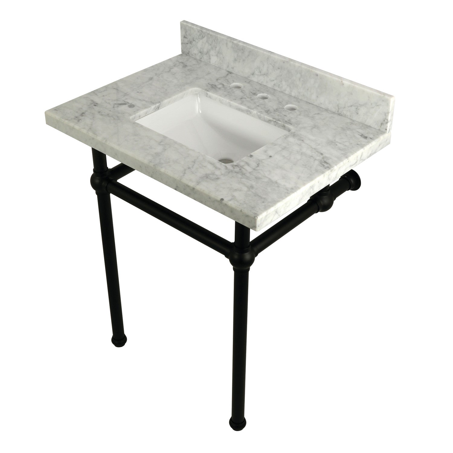 With a beautiful Carrara marble counter top, this console sink set is a long lasting, durable, and elegant addition to your bathroom. A fabulous alternative where space is limited or tight, making them friendly for the whole family. With different shades and natural designs, otherwise known as veining, no two sinks will be alike. Also for your convenience, anti-slip rubber pads are included with the brass legs to ensure steadiness. Water supply kit, drain assembly, and the faucet are sold separately. Kingston's carrara marble tops are polished, but they are not sealed. Polished marble has a shiny surface and resists stains. Natural stone, even when polished, is still somewhat porous and does remain susceptible to etching by acidic compounds like fruit juice, vinegar, some cleaning solvents, etc. For customers that wish to further protect their investment the marble can be sealed. The following is intended solely for informational purposes. Kingston does not warranty nor accept liability for damages or other negative outcomes resulting from any treatment or coating applied to the countertop after purchase, whether applied by the customer or by a third party. For anyone unfamiliar with this nature of project, Kingston recommends consulting an experienced professional in your area. When looking for a sealant product, please be sure to seek a product specifically designed for use on polished marble, granite or other natural stone surfaces. Be sure to always avoid anything containing a citrus ingredient, acid ingredient, tung oil, linseed oil, or other natural oils. These can damage or discolor your marble.