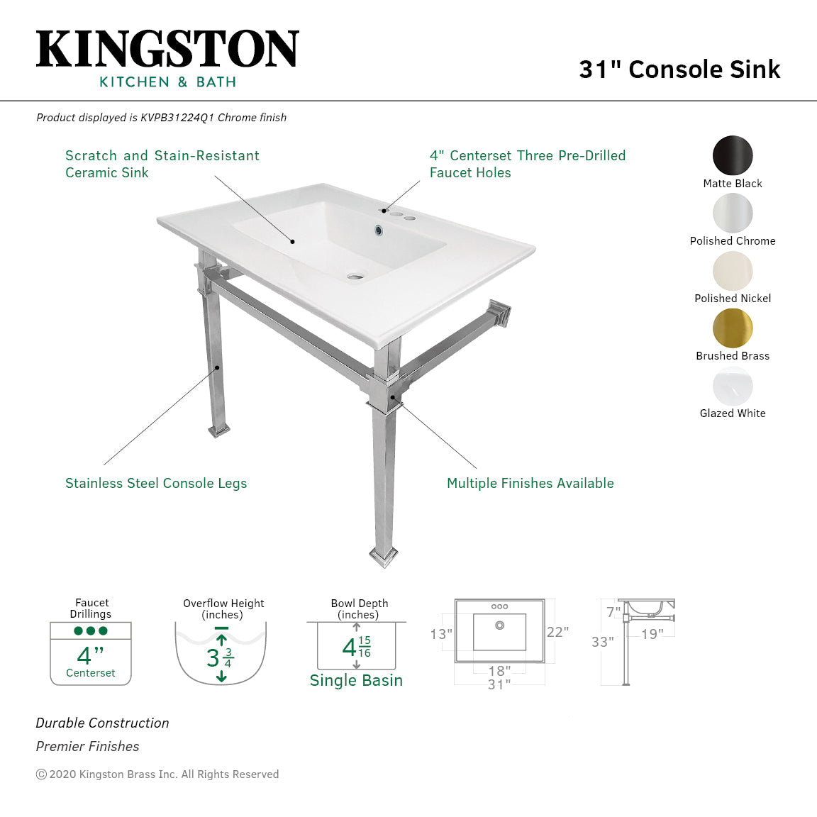 With a beautiful ceramic counter top, this console sink set is a long lasting, durable, and elegant addition to your bathroom. Solid ceramic sinks and tops like the LBT-series top in this listing are finished with a glossy glaze on the top and sink basin interior, making for a pristine, stain-resistant surface and glistening finish that is easily maintained. The underside and basin exterior are unglazed/unfinished and coated with a matte white protective sealant that prevents moisture absorption and staining. Solid ceramic pieces cannot be glazed on all sides, because the nature of ceramic material requires a minimum surface area be left raw during the glaze firing process so the piece does not explode. Also for your convenience, anti-slip rubber pads are included with the stainless steel legs to ensure steadiness. Water supply kit, drain assembly, and the faucet are sold separately.