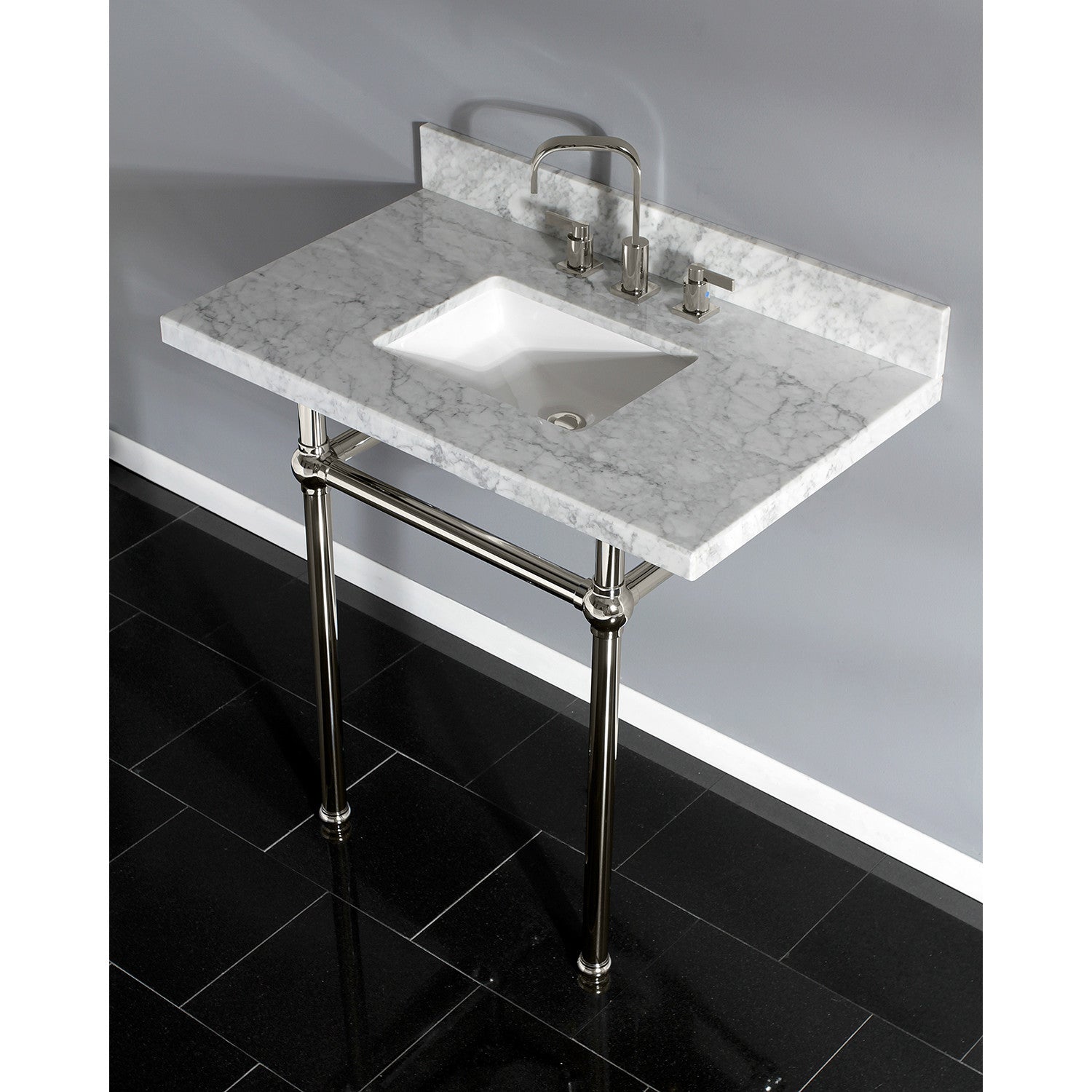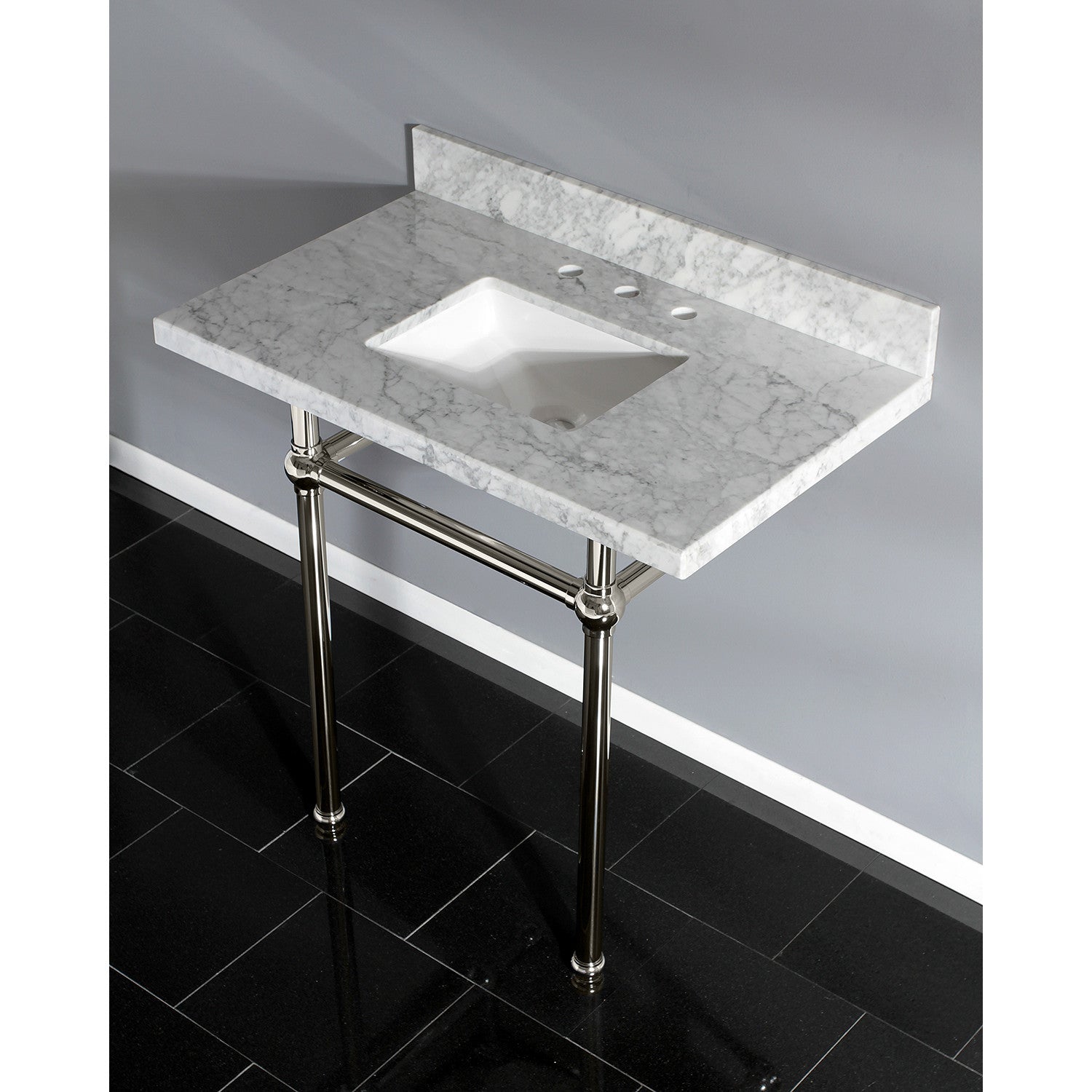 With a beautiful Carrara marble counter top, this console sink set is a long lasting, durable, and elegant addition to your bathroom. A fabulous alternative where space is limited or tight, making them friendly for the whole family. With different shades and natural designs, otherwise known as veining, no two sinks will be alike. Also for your convenience, anti-slip rubber pads are included with the brass legs to ensure steadiness. Water supply kit, drain assembly, and the faucet are sold separately. Kingston's carrara marble tops are polished, but they are not sealed. Polished marble has a shiny surface and resists stains. Natural stone, even when polished, is still somewhat porous and does remain susceptible to etching by acidic compounds like fruit juice, vinegar, some cleaning solvents, etc. For customers that wish to further protect their investment the marble can be sealed. The following is intended solely for informational purposes. Kingston does not warranty nor accept liability for damages or other negative outcomes resulting from any treatment or coating applied to the countertop after purchase, whether applied by the customer or by a third party. For anyone unfamiliar with this nature of project, Kingston recommends consulting an experienced professional in your area. When looking for a sealant product, please be sure to seek a product specifically designed for use on polished marble, granite or other natural stone surfaces. Be sure to always avoid anything containing a citrus ingredient, acid ingredient, tung oil, linseed oil, or other natural oils. These can damage or discolor your marble.