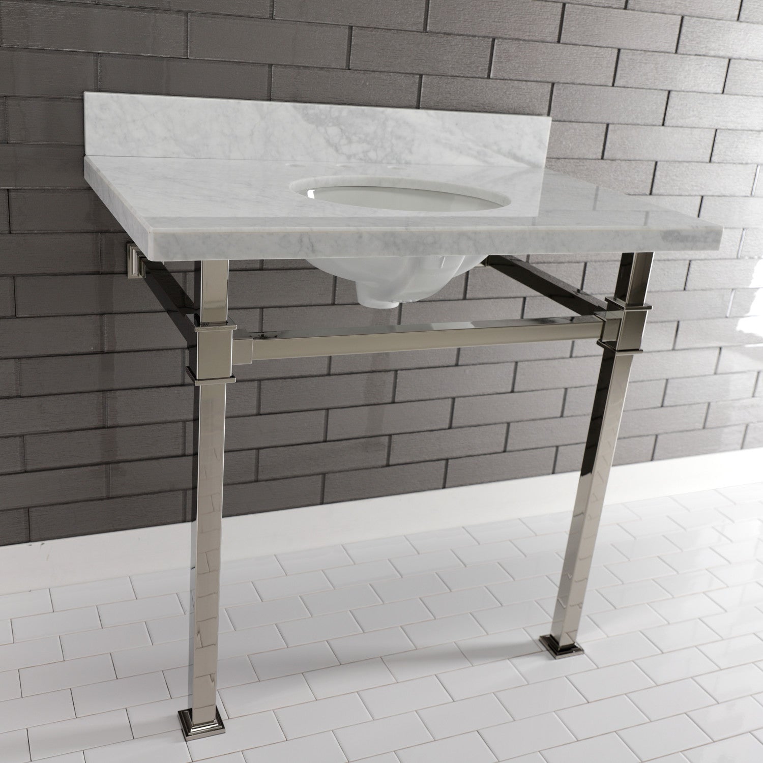 With a beautiful Carrara marble vanity top, this console sink set is a long lasting, durable, and elegant addition to your bathroom. A fabulous alternative where space is limited or tight, making them friendly for the whole family. With different shades and natural designs, otherwise known as veining, no two sinks will be alike. Also for your convenience, anti-slip rubber pads are included with the stainless steel legs to ensure steadiness. Water supply kit, drain assembly, and the faucet are sold separately. Kingston's carrara marble tops are polished, but they are not sealed. Polished marble has a shiny surface and resists stains. Natural stone, even when polished, is still somewhat porous and does remain susceptible to etching by acidic compounds like fruit juice, vinegar, some cleaning solvents, etc. For customers that wish to further protect their investment the marble can be sealed. The following is intended solely for informational purposes. Kingston does not warranty nor accept liability for damages or other negative outcomes resulting from any treatment or coating applied to the countertop after purchase, whether applied by the customer or by a third party. For anyone unfamiliar with this nature of project, Kingston recommends consulting an experienced professional in your area. When looking for a sealant product, please be sure to seek a product specifically designed for use on polished marble, granite or other natural stone surfaces. Be sure to always avoid anything containing a citrus ingredient, acid ingredient, tung oil, linseed oil, or other natural oils. These can damage or discolor your marble.