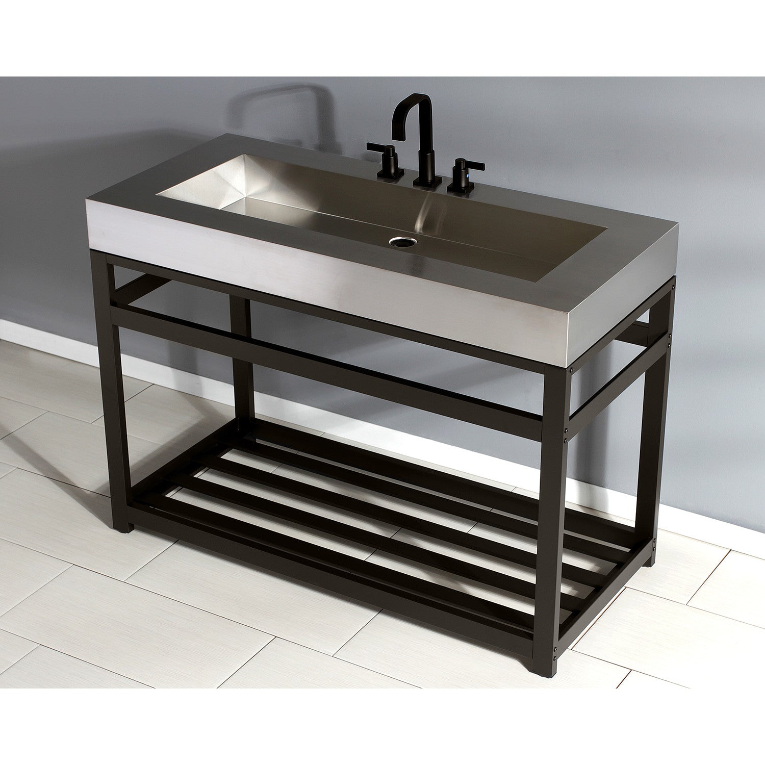 The Kingston Commercial collection brings forth bold design and smooth lines, enhancing your contemporarily styled home. Heavy, durable, and beautiful, this bathroom sink top will give your bathroom a sleek, modern design. Constructed out of stainless steel, this sink top is built for long-lasting durability while offering contemporary stylings. The Kingston Commercial 49" stainless steel console vanity sink features a wash basin and steel base that can be accented with a handful of finish options. With a rust-resistant brushed finish, stainless steel is also resistant to scratches for a long-lasting, durable product. These console vanities will stylishly and effortlessly become a part of your home, completing your modern bathroom ensemble.