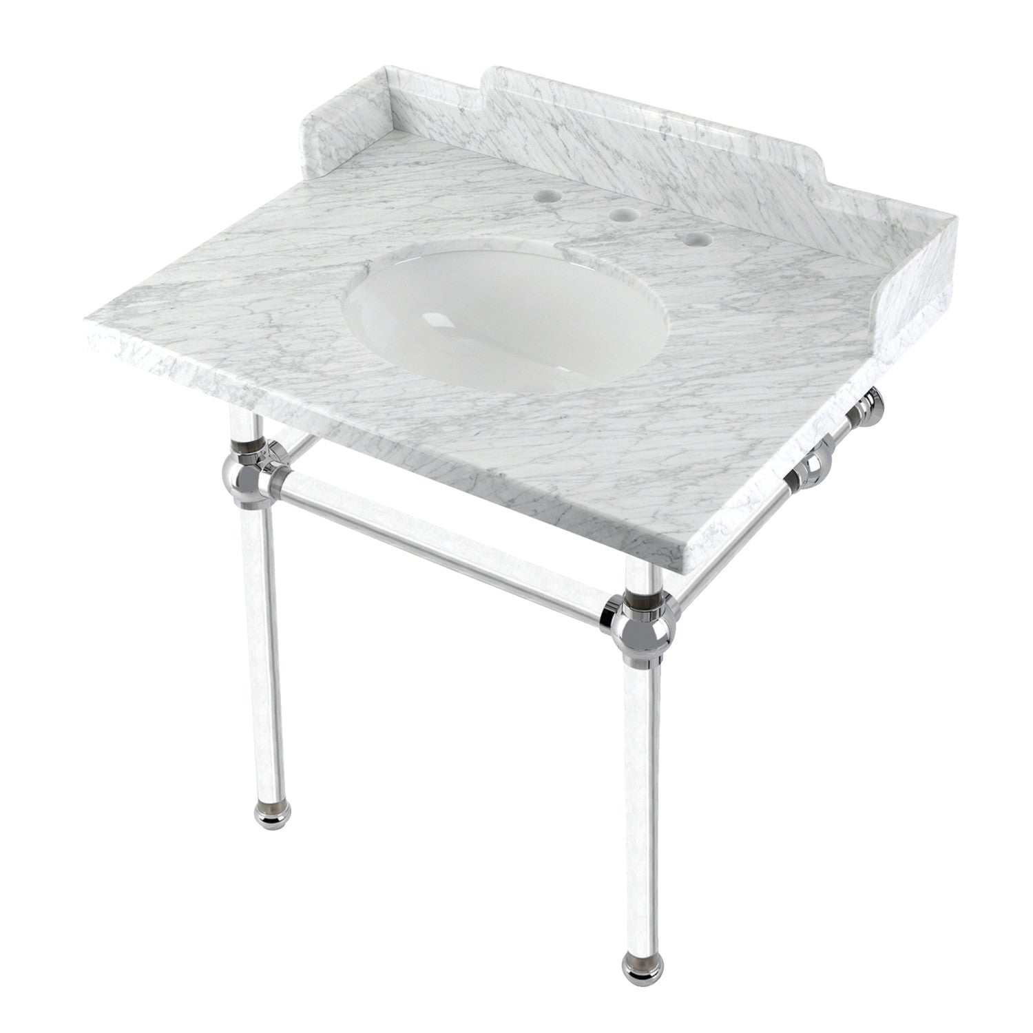 With a beautiful carrara marble counter top, this console sink set is a long lasting, durable, and elegant addition to your bathroom. A fabulous alternative where space is limited or tight, making them friendly for the whole family. With different shades and natural designs, otherwise known as veining, no two sinks will be alike. Also for your convenience, anti-slip rubber pads are included with the acrylic legs to ensure steadiness. Water supply kit, drain assembly, and the faucet are sold separately. Kingston's carrara marble tops are polished, but they are not sealed. Polished marble has a shiny surface and resists stains. Natural stone, even when polished, is still somewhat porous and does remain susceptible to etching by acidic compounds like fruit juice, vinegar, some cleaning solvents, etc. For customers that wish to further protect their investment the marble can be sealed. The following is intended solely for informational purposes. Kingston does not warranty nor accept liability for damages or other negative outcomes resulting from any treatment or coating applied to the countertop after purchase, whether applied by the customer or by a third party. For anyone unfamiliar with this nature of project, Kingston recommends consulting an experienced professional in your area. When looking for a sealant product, please be sure to seek a product specifically designed for use on polished marble, granite or other natural stone surfaces. Be sure to always avoid anything containing a citrus ingredient, acid ingredient, tung oil, linseed oil, or other natural oils. These can damage or discolor your marble.