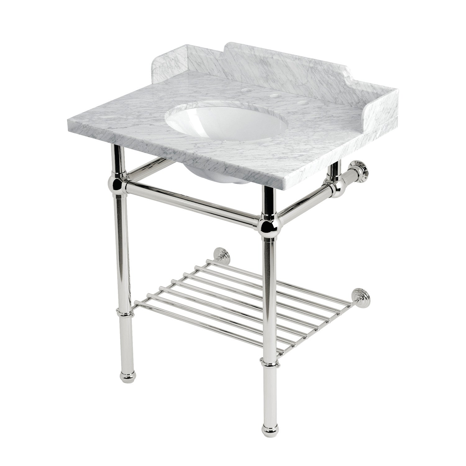 Enhance your bathroom with this exquisite console sink set featuring decorative traditional brass legs and a stunning Carrara Marble countertop. This set is designed for long-lasting durability and is perfect for compact or tight spaces. It comes complete with a pre-installed undermount oval basin, ensuring effortless maintenance. The countertop's flawless, stain-resistant surface and the brass legs' gleaming appearance make this set a captivating centerpiece in your bathroom decor. Please note that this set includes decorative backsplash and partial side splashes as well as a shelf that will help you maximize your storage space while adding a touch of elegance; however, the water supply kit, drain assembly, and faucet are sold separately, allowing you to customize your choices according to your style and preferences.