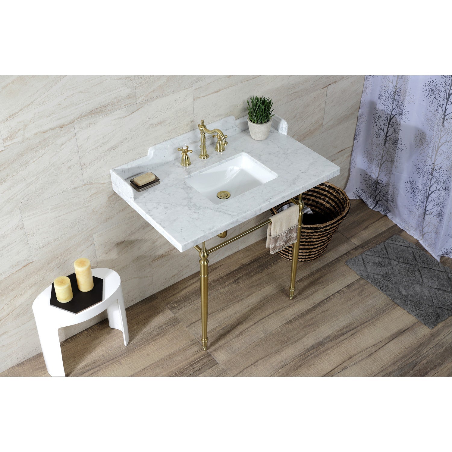 With a beautiful carrara marble counter top, this 36" x 22" console sink set with back and side splashes is a long lasting, durable, and elegant addition to your bathroom. A fabulous alternative where space is limited or tight making them friendly for the whole family. With different shades and natural designs, otherwise known as veining, no two sinks will be alike. Also for your convenience, anti-slip rubber pads are included with the brass legs to ensure steadiness. Water supply kit, drain assembly, and the faucet are sold separately. Kingston's carrara marble tops are polished, but they are not sealed. Polished marble has a shiny surface and resists stains. Natural stone, even when polished, is still somewhat porous and does remain susceptible to etching by acidic compounds like fruit juice, vinegar, some cleaning solvents, etc. For customers that wish to further protect their investment the marble can be sealed. The following is intended solely for informational purposes. Kingston does not warranty nor accept liability for damages or other negative outcomes resulting from any treatment or coating applied to the countertop after purchase, whether applied by the customer or by a third party. For anyone unfamiliar with this nature of project, Kingston recommends consulting an experienced professional in your area. When looking for a sealant product, please be sure to seek a product specifically designed for use on polished marble, granite or other natural stone surfaces. Be sure to always avoid anything containing a citrus ingredient, acid ingredient, tung oil, linseed oil, or other natural oils. These can damage or discolor your marble.